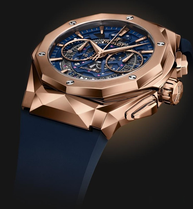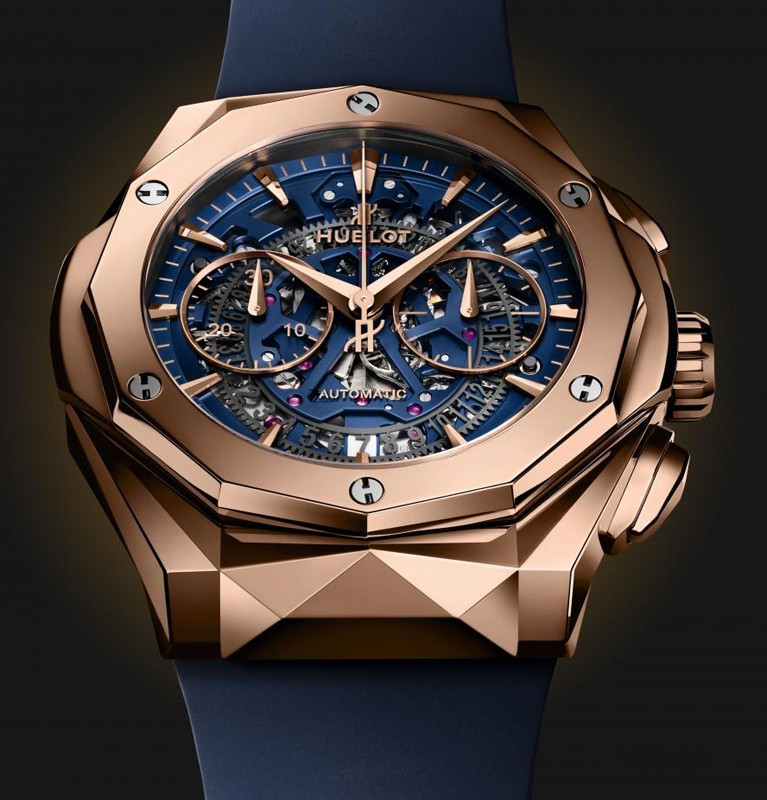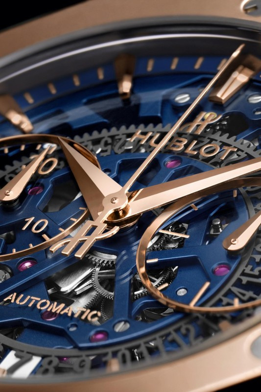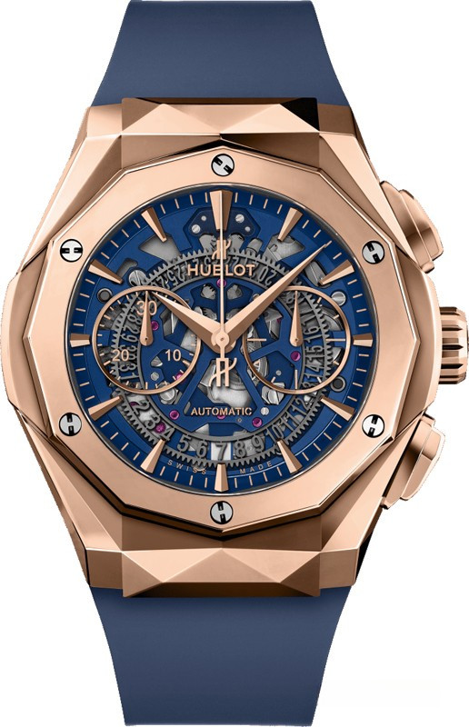 Часы Hublot Classic Fusion Aerofusion Chronograph Orlinski 45 mm представлены в корпусе из розового золота 18к размером 45 мм и водонепроницаемостью 50 м. Внутри корпуса установлен автоматический механизм, Калибр HUB1155, обладающий запасом хода 42 часа. На синем скелетированном циферблате отображаются часы, минуты, секунды, дата, накопители хронографа. Часы комплектуются каучуковым ремешком с вставкой из розового золота 18к. Серия ограничена - 200 шт.