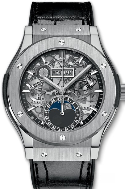 Мужские часы Hublot Classic Fusion Aeromoon 547.NX.0170.LR выпущены в корпусе Classic Fusion диаметром 42 mm из титана. Безель корпуса выпущен из титана с 6 H-образными полированными титановыми винтами с утопленной головкой. Над циферблатом установлено сапфировое стекло с антибликовым покрытием. Выступы безеля: черный композитный материал, заводная головка из титана с выгравированной буквой Н для «Hublot». Задняя часть корпуса открытая, из титана с сапфировым стеклом с внутренним антибликовым покрытием. Водонепроницаемость составляет приблизительно 50 м. На сером циферблате расположены полированные покрытые родием жезлообразные индексы и стрелки. Часовой механизм HUB1131 с автоматическим заводом имеет запас хода 42 часа. Индикатор фазы Луны находится в позиции 6 часов, аналоговый индикатор даты в позиции 6 часов, окошко для индикации дней и месяцев в позиции 12 часов. Ремешок из черной кожи аллигатора, нашитой на черном каучуке с таким же черным швом. Раскладная застежка из нержавеющей стали с черным вакуумным напылением.
