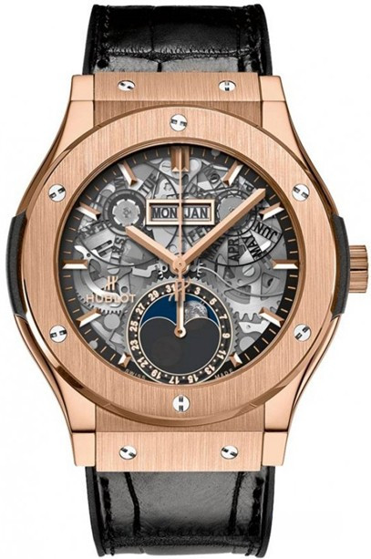 Мужские часы Hublot Classic Fusion Aeromoon 547.OX.0180.LR выпущены в корпусе Classic Fusion диаметром 42 mm из розового золота 18к. Безель корпуса выпущен из розового золота 18к с 6 H-образными полированными титановыми винтами с утопленной головкой. Над циферблатом установлено сапфировое стекло с антибликовым покрытием. Выступы безеля: черный композитный материал, заводная головка из розового золота 18к с выгравированной буквой Н для «Hublot». Задняя часть корпуса открытая, из розового золота 18к с сапфировым стеклом с внутренним антибликовым покрытием. Водонепроницаемость составляет приблизительно 50 м. На сером циферблате расположены полированные золотистые жезлообразные индексы и стрелки. Часовой механизм HUB1131 с автоматическим заводом имеет запас хода 42 часа. Индикатор фазы Луны находится в позиции 6 часов, аналоговый индикатор даты в позиции 6 часов, окошко для индикации дней и месяцев в позиции 12 часов. Ремешок из черной кожи аллигатора, нашитой на черном каучуке с таким же черным швом. Раскладная застежка из розового золота 18к.