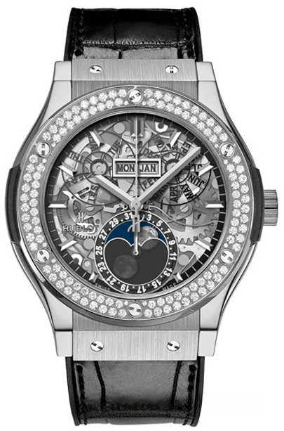 Мужские часы Hublot Classic Fusion Aeromoon 517.NX.0170.LR.1104 выпущены в корпусе Classic Fusion диаметром 45 mm из титана. Безель корпуса выпущен из титана с 6 H-образными полированными титановыми винтами с утопленной головкой, инкрустирован белыми бриллиантами. Над циферблатом установлено сапфировое стекло с антибликовым покрытием. Выступы безеля: черный композитный материал, заводная головка из титана с выгравированной буквой Н для «Hublot». Задняя часть корпуса открытая, из титана с сапфировым стеклом с внутренним антибликовым покрытием. Водонепроницаемость составляет приблизительно 50 м. На сером циферблате расположены полированные покрытые родием жезлообразные индексы и стрелки. Часовой механизм HUB1131 с автоматическим заводом имеет запас хода 42 часа. Индикатор фазы Луны находится в позиции 6 часов, аналоговый индикатор даты в позиции 6 часов, окошко для индикации дней и месяцев в позиции 12 часов. Ремешок из черной кожи аллигатора, нашитой на черном каучуке с таким же черным швом. Раскладная застежка из нержавеющей стали с черным вакуумным напылением.