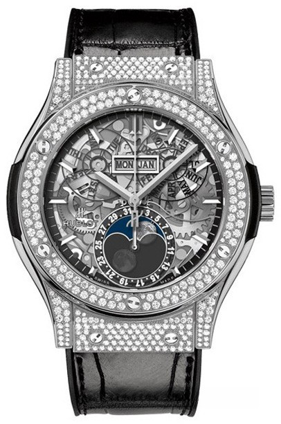 Мужские часы Hublot Classic Fusion Aeromoon 517.NX.0170.LR.1704 выпущены в корпусе Classic Fusion диаметром 45 mm из титана. Безель корпуса выпущен из титана с 6 H-образными полированными титановыми винтами с утопленной головкой, корпус инкрустирован белыми бриллиантами. Над циферблатом установлено сапфировое стекло с антибликовым покрытием. Выступы безеля: черный композитный материал, заводная головка из титана с выгравированной буквой Н для «Hublot». Задняя часть корпуса открытая, из титана с сапфировым стеклом с внутренним антибликовым покрытием. Водонепроницаемость составляет приблизительно 50 м. На сером циферблате расположены полированные покрытые родием жезлообразные индексы и стрелки. Часовой механизм HUB1131 с автоматическим заводом имеет запас хода 42 часа. Индикатор фазы Луны находится в позиции 6 часов, аналоговый индикатор даты в позиции 6 часов, окошко для индикации дней и месяцев в позиции 12 часов. Ремешок из черной кожи аллигатора, нашитой на черном каучуке с таким же черным швом. Раскладная застежка из нержавеющей стали с черным вакуумным напылением.