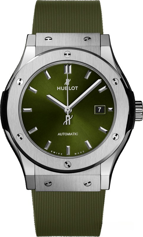 Часы Classic Fusion 42 mm выполнены из титана. Безель с 6 титановыми винтами, характерными для коллекции бренда. Боковые части корпуса изготовлены из черного каучука. Рифленая заводная головка. Циферблат зеленого цвета, отчетливо видны центральная часовая, минутная и секундная стрелки, окошко даты на 3-х часах. Сапфировое стекло с антибликовым покрытием с обеих сторон. Механизм автоматический, Калибр HUB1110 собран на 28 драгоценных камнях с частотой баланса в 28800 пол/час. Запас хода 42 часа. Ремешок из каучука с застежкой из нержавеющей стали.