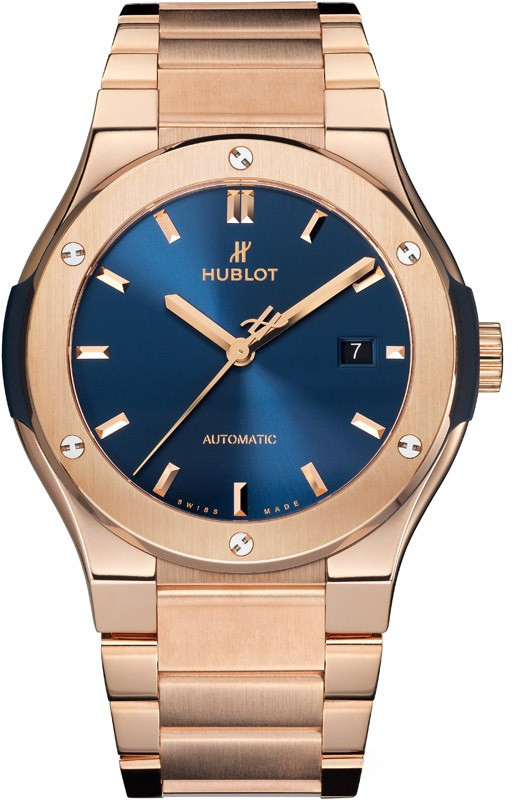 Классическая модель наручных часов Classic Fusion Blue King Gold была представлена компанией Hublot. Элегантный корпус выполнен из матового розового золота 18к с полировкой, часы доступны в размере 42 мм. Золотой безель закреплен 6 Н-образными золотыми винтами. Сапфировое стекло с антибликовым покрытием надежно защищает циферблат синего цвета с эксклюзивным гильоше. Окружность циферблата украшена часовыми метками багетной формы. В центре разместились указательные стрелки: часовая, минутная и секундная (украшена логотипом компании). В положении 3 часа разместилось окошко показывающее дату по календарю. Заводная головка размещенная по соседству, которая настраивает все функции часов. Корпус скрывает в себе часовой механизм с автоматическим подзаводом, Калибр HUB1110. Обеспечивает беспрерывный ход 42 часа. Часы комплектуются золотым браслетом.