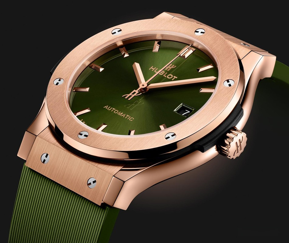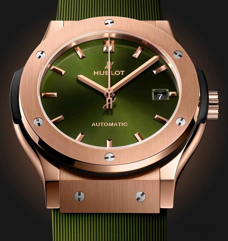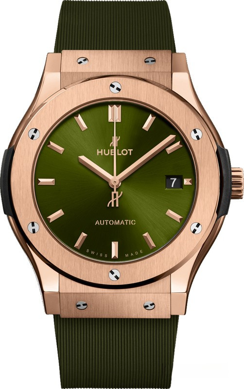 Часы Hublot Classic Fusion представлены в корпусе из розового золота 18к диаметром 45 мм водонепроницаемостью 50 метров. Внутри корпуса установлен автоматический механизм, Калибр HUB1112 с запасом хода 42 часа. На зеленом циферблате отображаются часы, минуты, секунды, дата. Часы поставляются каучуковом ремешке с золотой застежкой.