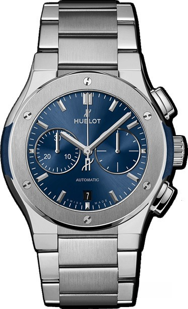 Часы Hublot Classic Fusion Aerofusion Chronograph Titanium преставлены в корпусе размером 42 мм из титана водонепроницаемостю до 50 метров. Внутри часов установлен автоматический механизм, Калибр HUB4302, с запасом хода 42 часа. На синем циферблате отображаются часы, минуты, секунды, дата, накопители хронографа. Часы комплектуются титановым браслетом.