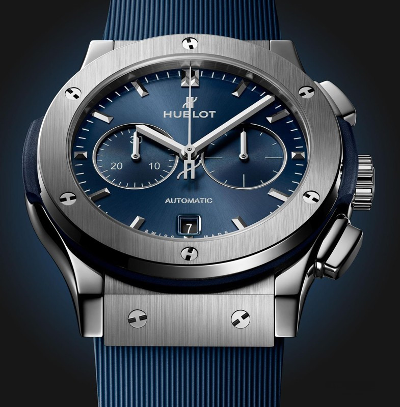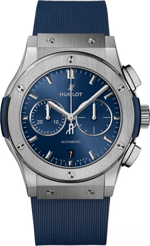 Часы Hublot Classic Fusion обладают круглым корпусом из титана диаметром 42 мм, водонепроницаемостью до 50 м. На торце рифленой заводной головки, расположенной на 3 часах, имеется логотип в виде большой буквы Н. Сапфировое стекло установлено на передней стороне часового корпуса (с антибликовым покрытием) и на его завинчивающейся задней крышке. Циферблат синего цвета. На циферблате симметрично расположены накопители хронографа. Модель оснащена мануфактурным швейцарским автоматическим механизмом с 42-часовым запасом хода, функциями индикации часов и минут (посредством соответствующих центральных стрелок), секунд и даты (посредством апертуры в позиции 6 часов). Калибр отменно отделан и декорирован. Поставляется на каучуковом ремешке.