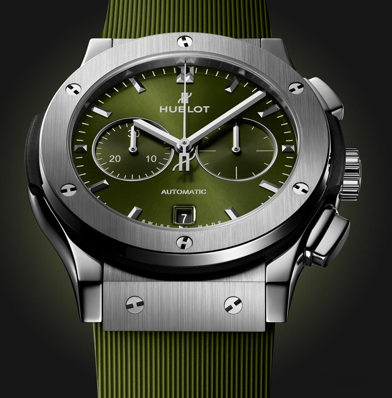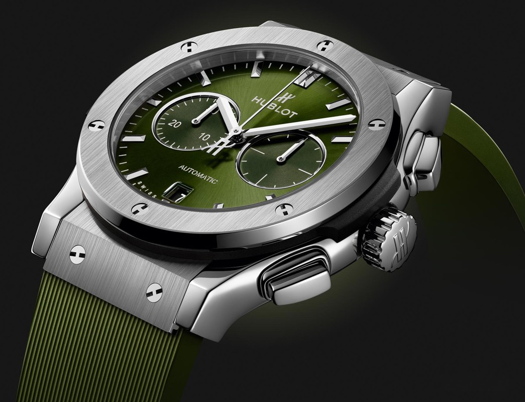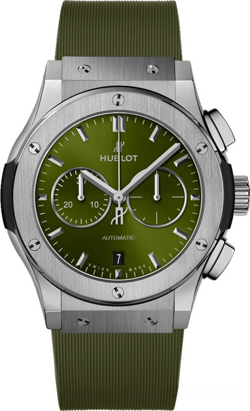 Часы Hublot Classic Fusion обладают круглым корпусом из титана диаметром 42 мм, водонепроницаемостью до 50 м. На торце рифленой заводной головки, расположенной на 3 часах, имеется логотип в виде большой буквы Н. Сапфировое стекло установлено на передней стороне часового корпуса (с антибликовым покрытием) и на его завинчивающейся задней крышке. Циферблат зеленого цвета. На циферблате симметрично расположены накопители хронографа. Модель оснащена мануфактурным швейцарским автоматическим механизмом с 42-часовым запасом хода, функциями индикации часов и минут (посредством соответствующих центральных стрелок), секунд и даты (посредством апертуры в позиции 6 часов). Калибр отменно отделан и декорирован. Поставляется на каучуковом ремешке.