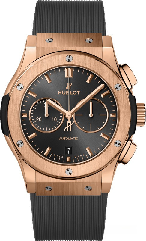 Часы Hublot Classic Fusion обладают круглым корпусом из розового золота 18к диаметром 42 мм, водонепроницаемостью до 50 м. На торце рифленой заводной головки, расположенной на 3 часах, имеется логотип в виде большой буквы Н. Сапфировое стекло установлено на передней стороне часового корпуса (с антибликовым покрытием) и на его завинчивающейся задней крышке. Циферблат серого цвета. На циферблате симметрично расположены накопители хронографа. Модель оснащена мануфактурным швейцарским автоматическим механизмом с 42-часовым запасом хода, функциями индикации часов и минут (посредством соответствующих центральных стрелок), секунд и даты (посредством апертуры в позиции 6 часов). Калибр отменно отделан и декорирован. Поставляется на каучуковом ремешке.