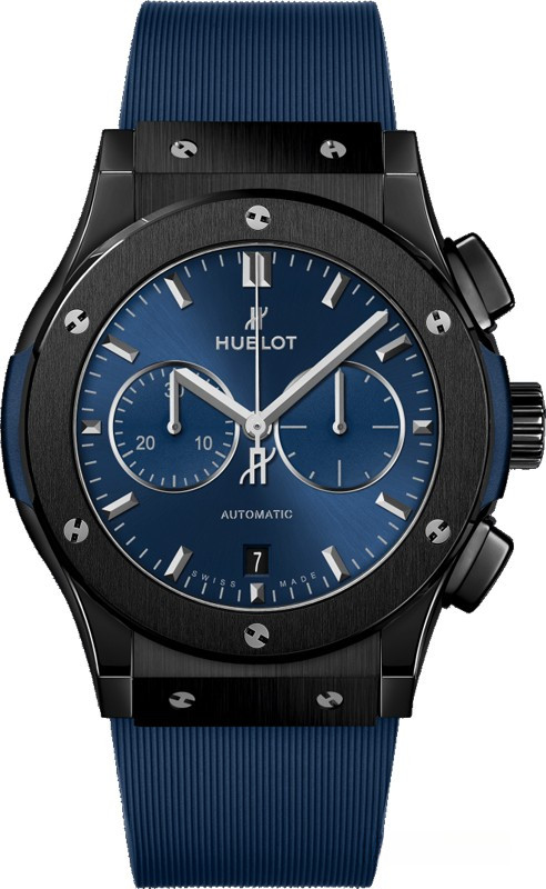Часы Hublot Classic Fusion обладают круглым корпусом из керамики диаметром 42 мм, водонепроницаемостью до 50 м. На торце рифленой заводной головки, расположенной на 3 часах, имеется логотип в виде большой буквы Н. Сапфировое стекло установлено на передней стороне часового корпуса (с антибликовым покрытием) и на его завинчивающейся задней крышке. Циферблат синего цвета. На циферблате симметрично расположены накопители хронографа. Модель оснащена мануфактурным швейцарским автоматическим механизмом с 42-часовым запасом хода, функциями индикации часов и минут (посредством соответствующих центральных стрелок), секунд и даты (посредством апертуры в позиции 6 часов). Калибр отменно отделан и декорирован. Поставляется на каучуковом ремешке.