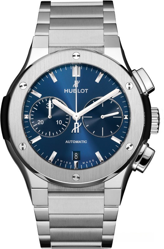 Классическая модель наручных часов Classic Fusion Chronograph Blue King Gold была представлена компанией Hublot. Элегантный корпус выполнен из матового титана с полировкой, часы доступны в размере 45 мм. Титановый безель закреплен 6 Н-образными титановыми винтами. Сапфировое стекло с антибликовым покрытием надежно защищает циферблат синего цвета с эксклюзивным гильоше. Окружность циферблата украшена часовыми метками багетной формы. На циферблате разместились указательные стрелки: часовая, минутная, секундная стрелка хронографа, 30-секундный и 12-часовой счетчики хронографа. В положении 6 часов разместилось окошко показывающее дату по календарю. Корпус скрывает в себе часовой механизм с автоматическим подзаводом, Калибр HUB1143. Обеспечивает беспрерывный ход 42 часа. Часы комплектуются титановым браслетом.