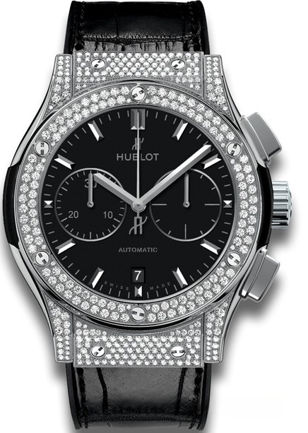 Часы Hublot Classic Fusion Fusion Chronograph Titanium 45 mm 521.NX.1171.LR.1704 обладают круглым корпусом из титана, диаметром 45 мм, водонепроницаемостью до 50 м. Корпус инкрустирован белыми бриллиантами. На торце рифленой заводной головки, расположенной на 3 часах, имеется логотип в виде большой буквы Н. Сапфировое стекло установлено на передней стороне часового корпуса (с антибликовым покрытием) и на его завинчивающейся задней крышке. Циферблат черного цвета. На циферблате симметрично расположены накопители хронографа. Модель оснащена мануфактурным автоматическим швейцарским механизмом. Калибр HUB 1143 с 42-часовым запасом хода, с функциями индикации часов, минут (посредством соответствующих центральных стрелок), секунд и даты (посредством апертуры в позиции 6 часов). Калибр отменно отделан и декорирован. Поставляется на ремешке из каучука и кожи аллигатора с вставкой из нержавеющей стали.