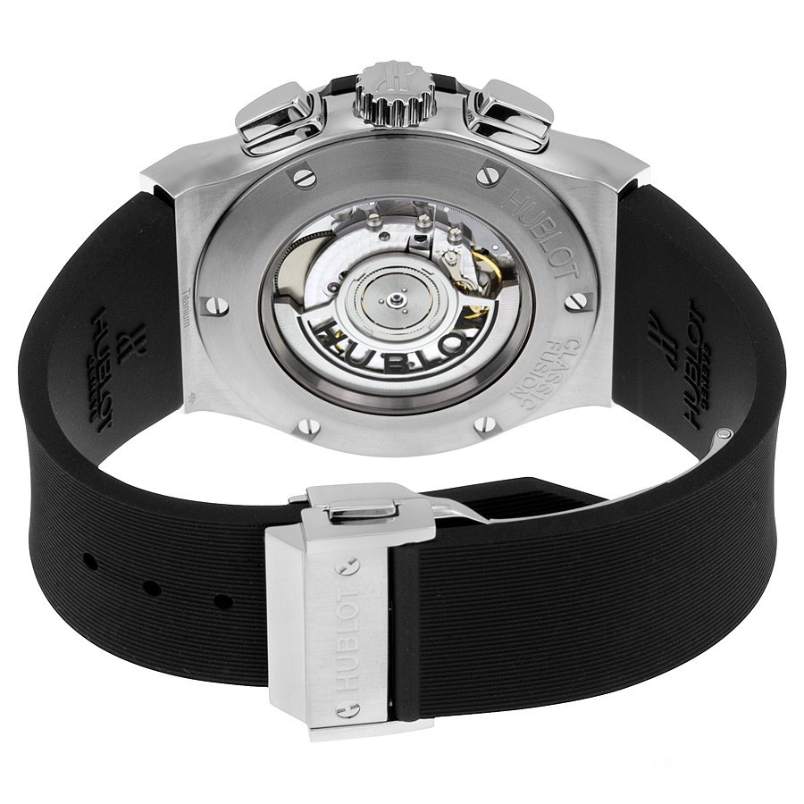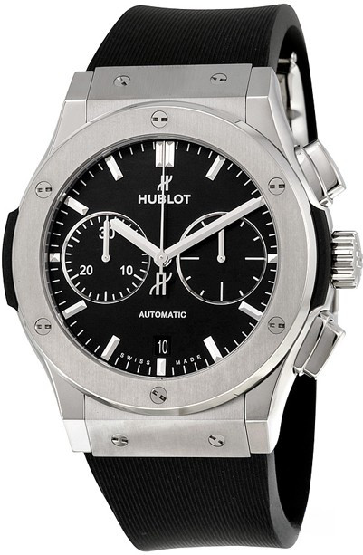 Часы Hublot Classic Fusion Fusion Chronograph Titanium обладают круглым корпусом из титана, диаметром 45 мм, водонепроницаемостью до 50 м. На торце рифленой заводной головки, расположенной на 3 часах, имеется логотип в виде большой буквы Н. Сапфировое стекло установлено на передней стороне часового корпуса (с антибликовым покрытием) и на его завинчивающейся задней крышке. Циферблат черного цвета. На циферблате симметрично расположены накопители хронографа. Модель оснащена мануфактурным автоматическим швейцарским механизмом. Калибр HUB 1143 с 42-часовым запасом хода, с функциями индикации часов, минут (посредством соответствующих центральных стрелок), секунд и даты (посредством апертуры в позиции 6 часов). Калибр отменно отделан и декорирован. Поставляется на каучуковом ремешке с титановой вставкой.