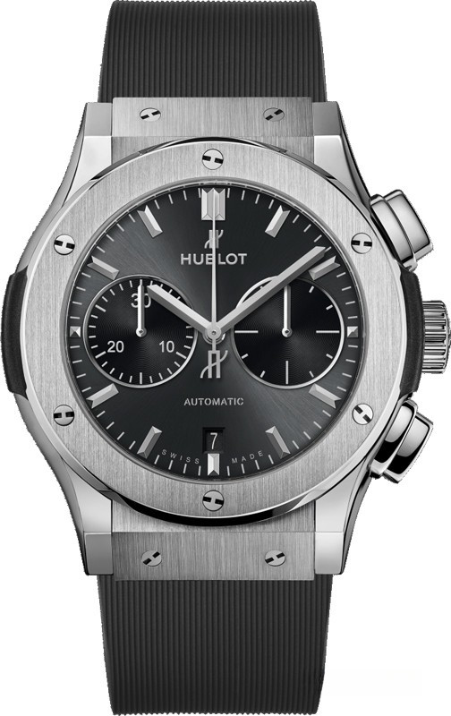 Часы Hublot Classic Fusion обладают круглым корпусом из титана диаметром 45 мм, водонепроницаемостью до 50 м. На торце рифленой заводной головки, расположенной на 3 часах, имеется логотип в виде большой буквы Н. Сапфировое стекло установлено на передней стороне часового корпуса (с антибликовым покрытием) и на его завинчивающейся задней крышке. Циферблат черный. На циферблате симметрично расположены накопители хронографа. Модель оснащена мануфактурным швейцарским автоматическим механизмом с 42-часовым запасом хода, функциями индикации часов и минут (посредством соответствующих центральных стрелок), секунд и даты (посредством апертуры в позиции 6 часов). Калибр отменно отделан и декорирован. Поставляется на каучуковом ремешке с застежкой из нержавеющей стали.