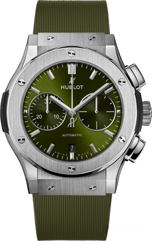 Часы Hublot Classic Fusion обладают круглым корпусом из титана диаметром 45 мм, водонепроницаемостью до 50 м. На торце рифленой заводной головки, расположенной на 3 часах, имеется логотип в виде большой буквы Н. Сапфировое стекло установлено на передней стороне часового корпуса (с антибликовым покрытием) и на его завинчивающейся задней крышке. Циферблат зеленый. На циферблате симметрично расположены накопители хронографа. Модель оснащена мануфактурным швейцарским автоматическим механизмом с 42-часовым запасом хода, функциями индикации часов и минут (посредством соответствующих центральных стрелок), секунд и даты (посредством апертуры в позиции 6 часов). Калибр отменно отделан и декорирован. Поставляется на каучуковом ремешке с застежкой из нержавеющей стали.
