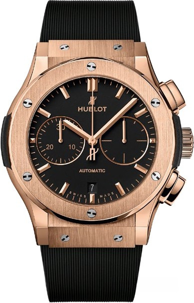 Часы Hublot Classic Fusion обладают круглым корпусом из розового золота 18к диаметром 45 мм, водонепроницаемостью до 50 м. На торце рифленой заводной головки, расположенной на 3 часах, имеется логотип в виде большой буквы Н. Сапфировое стекло установлено на передней стороне часового корпуса (с антибликовым покрытием) и на его завинчивающейся задней крышке. Циферблат черный. На циферблате симметрично расположены накопители хронографа. Модель оснащена мануфактурным швейцарским автоматическим механизмом с 42-часовым запасом хода, функциями индикации часов и минут (посредством соответствующих центральных стрелок), секунд и даты (посредством апертуры в позиции 6 часов). Калибр отменно отделан и декорирован. Поставляется на каучуковом ремешке с вставкой из розового золота 18к.