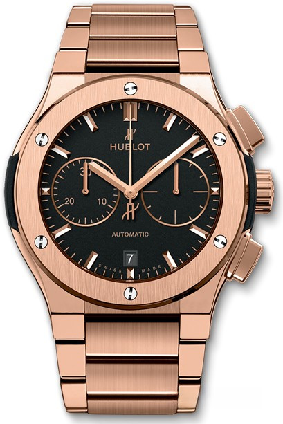 Часы Hublot Classic Fusion Fusion Chronograph Gold 520.OX.1180.OX обладают круглым корпусом из 18-каратного розового золота, диаметром 45 мм, водонепроницаемостью до 50 м. На торце рифленой заводной головки, расположенной на 3 часах, имеется логотип в виде большой буквы Н. Сапфировое стекло установлено на передней стороне часового корпуса (с антибликовым покрытием) и на его завинчивающейся задней крышке. Циферблат черного цвета. На циферблате симметрично расположены накопители хронографа. Модель оснащена мануфактурным автоматическим швейцарским механизмом. Калибр HUB 1143 с 42-часовым запасом хода, с функциями индикации часов, минут (посредством соответствующих центральных стрелок), секунд и даты (посредством апертуры в позиции 6 часов). Калибр отменно отделан и декорирован. Поставляется на золотом браслете.