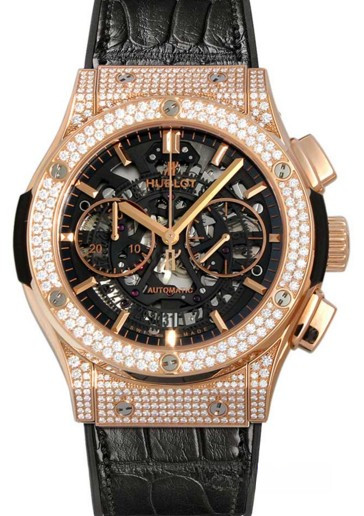Часы Hublot Classic Fusion Fusion Chronograph Gold 525.OX.0180.LR.1704 обладают круглым корпусом из 18-каратного розового золота, диаметром 45 мм, водонепроницаемостью до 50 м. Корпус инкрустирован белыми бриллиантами. На торце рифленой заводной головки, расположенной на 3 часах, имеется логотип в виде большой буквы Н. Сапфировое стекло установлено на передней стороне часового корпуса (с антибликовым покрытием) и на его завинчивающейся задней крышке. Циферблат черного цвета скелетированный. На циферблате симметрично расположены накопители хронографа. Модель оснащена мануфактурным автоматическим швейцарским механизмом. Калибр HUB 1143 с 42-часовым запасом хода, с функциями индикации часов, минут (посредством соответствующих центральных стрелок), секунд и даты (посредством апертуры в позиции 6 часов). Калибр отменно отделан и декорирован. Поставляется на ремешке из каучука и кожи аллигатора с вставкой из 18-каратного розового золота.