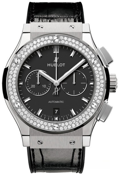 Часы Hublot Classic Fusion Fusion Chronograph Titanium 45 mm 521.NX.1171.LR.1104 обладают круглым корпусом из титана, диаметром 45 мм, водонепроницаемостью до 50 м. Безель из белых бриллиантов. На торце рифленой заводной головки, расположенной на 3 часах, имеется логотип в виде большой буквы Н. Сапфировое стекло установлено на передней стороне часового корпуса (с антибликовым покрытием) и на его завинчивающейся задней крышке. Циферблат черного цвета. На циферблате симметрично расположены накопители хронографа. Модель оснащена мануфактурным автоматическим швейцарским механизмом. Калибр HUB 1143 с 42-часовым запасом хода, с функциями индикации часов, минут (посредством соответствующих центральных стрелок), секунд и даты (посредством апертуры в позиции 6 часов). Калибр отменно отделан и декорирован. Поставляется на ремешке из каучука и кожи аллигатора с вставкой из нержавеющей стали.