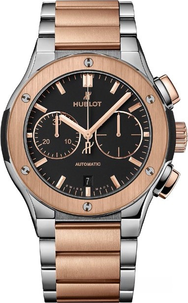 Часы Hublot Classic Fusion Chronograph Integrated Bracelet King Gold 42 mm представлены в корпусе из титана и розового золота 18к размером 42 мм и водонепроницаемостью 50 метров. Внутри корпуса установлен автоматический механизм, Калибр HUB1143, обладающий запасом хода 42 часа. На черном циферблате отображаются часы, минуты, секунды, дата, накопители хронографа. Часы поставляются на браслете из розового золота 18к и титана.