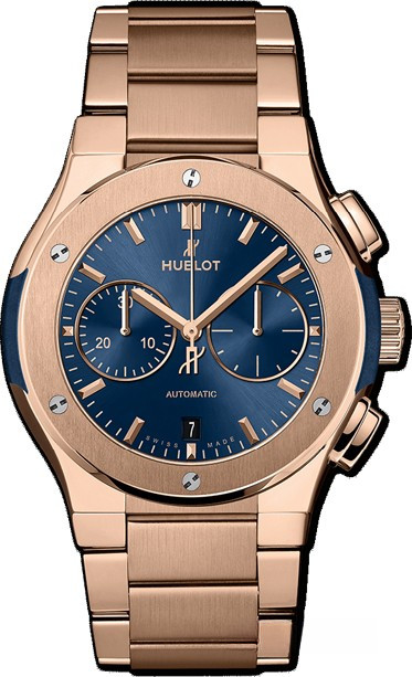 Часы Hublot Classic Fusion Chronograph Integrated Bracelet King Gold Blue 42 mm представлены в корпусе из розового золота 18к размером 42 мм и водонепроницаемостью 50 метров. Внутри корпуса установлен автоматический механизм, Калибр HUB1143, обладающий запасом хода 42 часа. На синем циферблате отображаются часы, минуты, секунды, дата, накопители хронографа. Часы поставляются на браслете из розового золота 18к.