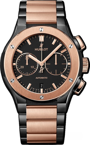 Часы Hublot Classic Fusion Chronograph Integrated Bracelet King Gold 42 mm представлены в корпусе из розового золота 18к и керамики размером 45 мм и водонепроницаемостью 50 метров. Внутри корпуса установлен автоматический механизм, Калибр HUB1143, обладающий запасом хода 42 часа. На черном циферблате отображаются часы, минуты, секунды, дата, накопители хронографа. Часы поставляются на браслете из розового золота 18к и керамики.