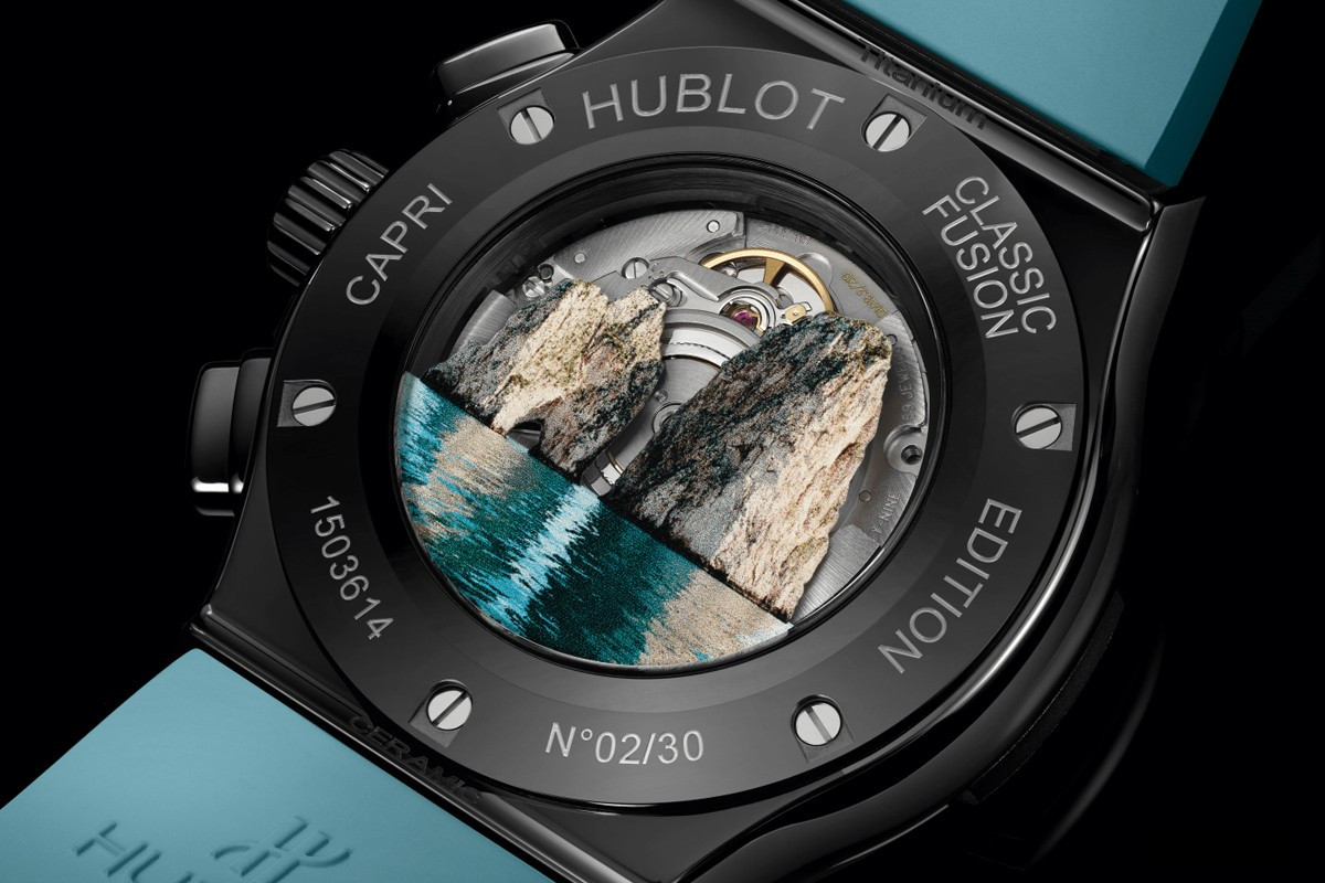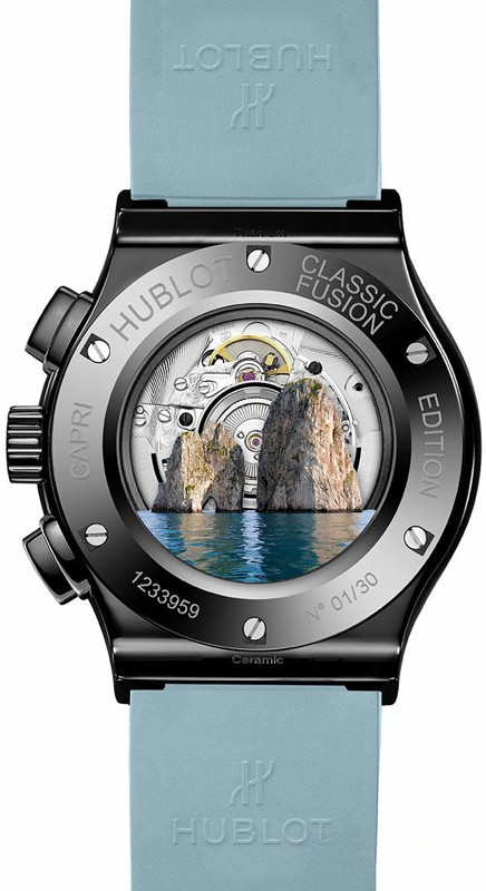 Часы Hublot Classic Fusion Chronograph Special Edition Capri представлены в корпусе размером 45 х 13.05 мм водонепроницаемостью 50 метров из керамики. Внутри корпуса установлен автоматический механизм хронографа, Калибр HUB1143, обладающий запасом хода 42 часа. На черном с голубыми накопителями хронографа циферблате отображаются часы, минуты, секунды, дата. Часы поставляются на голубом каучуковом ремешке с вставкой из нержавеющей стали. Серия огранияена - 30 штук.