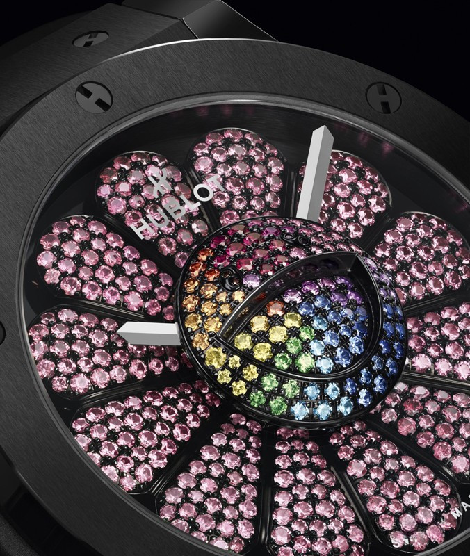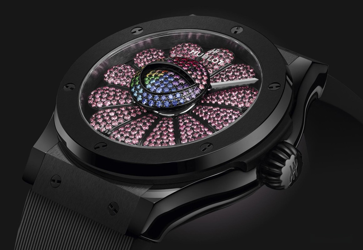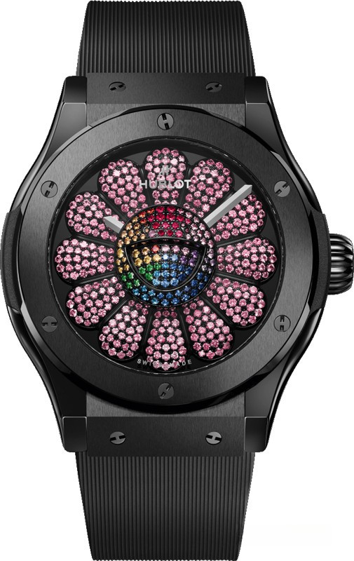 Часы Hublot Classic Fusion Takashi Murakami 45 mm представлены в корпусе диаметром 45 мм из керамики водонепроницаемостью 50 метров. Внутри корпуса установлен автоматический механизм, Калибр HUB1214, обладающий запасом хода 72 часа. На циферблате с розовыми сапфирами отображаются часы, минуты. Часы поставляются на каучуковом ремешке с застежкой из нержавеющей стали. Серия ограничена - 1 шт.