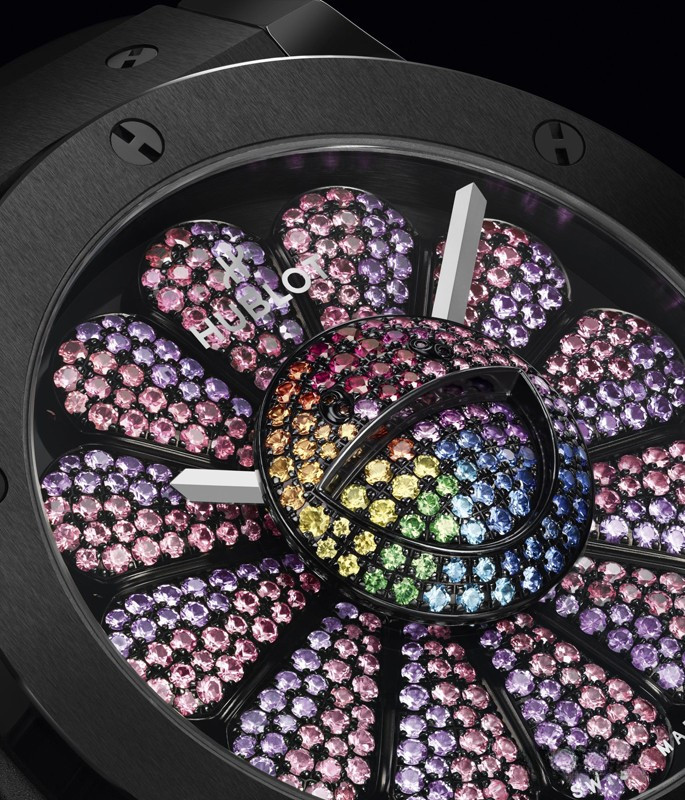 Часы Hublot Classic Fusion Takashi Murakami 45 mm представлены в корпусе диаметром 45 мм из керамики водонепроницаемостью 50 метров. Внутри корпуса установлен автоматический механизм, Калибр HUB1214, обладающий запасом хода 72 часа. На циферблате с розовыми сапфирами и аметистами отображаются часы, минуты. Часы поставляются на каучуковом ремешке с застежкой из нержавеющей стали. Серия ограничена - 1 шт.