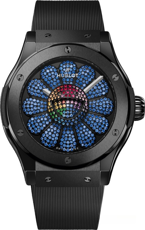 Часы Hublot Classic Fusion Takashi Murakami 45 mm представлены в корпусе диаметром 45 мм из керамики водонепроницаемостью 50 метров. Внутри корпуса установлен автоматический механизм, Калибр HUB1214, обладающий запасом хода 72 часа. На циферблате с синими сапфирами отображаются часы, минуты. Часы поставляются на каучуковом ремешке с застежкой из нержавеющей стали. Серия ограничена - 1 шт.