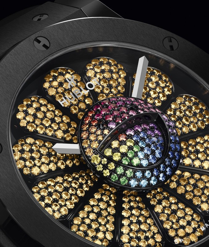 Часы Hublot Classic Fusion Takashi Murakami 45 mm представлены в корпусе диаметром 45 мм из керамики водонепроницаемостью 50 метров. Внутри корпуса установлен автоматический механизм, Калибр HUB1214, обладающий запасом хода 72 часа. На циферблате с желтыми сапфирами отображаются часы, минуты. Часы поставляются на каучуковом ремешке с застежкой из нержавеющей стали. Серия ограничена - 1 шт.