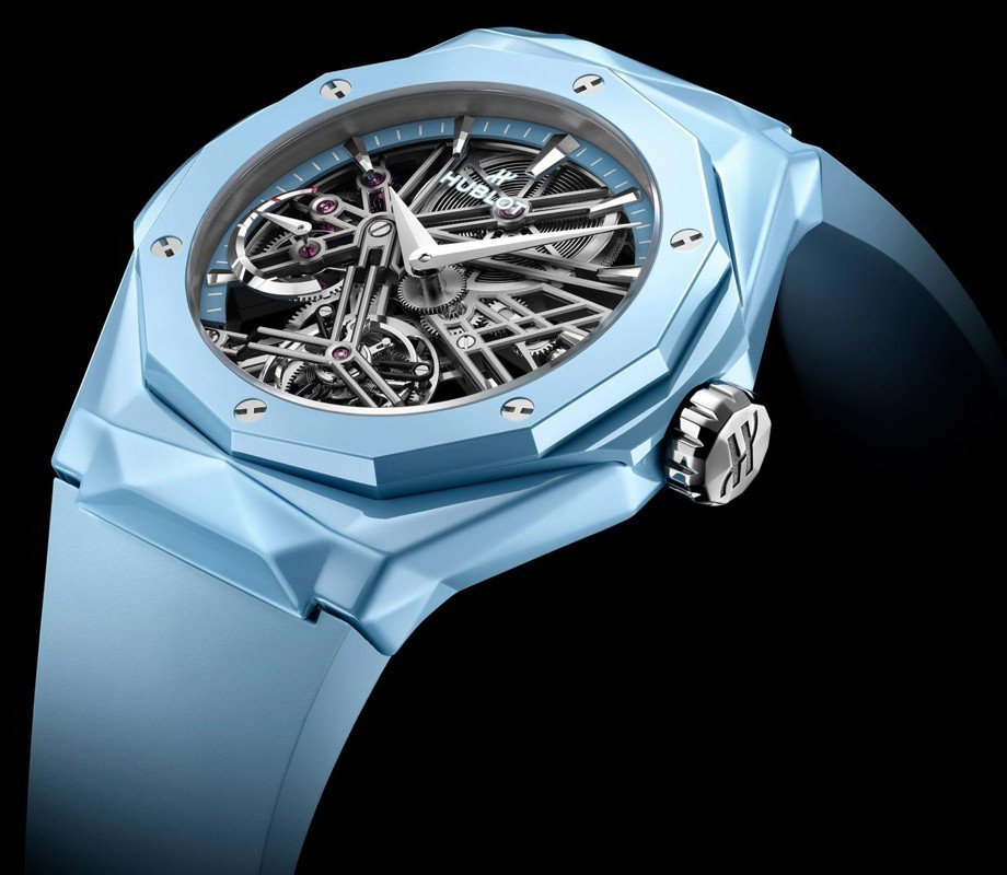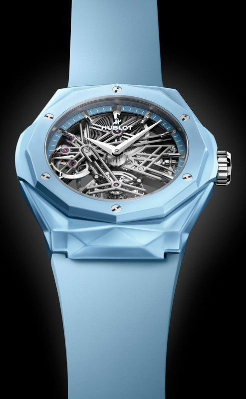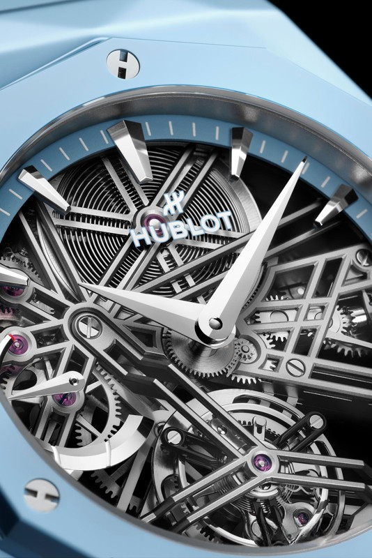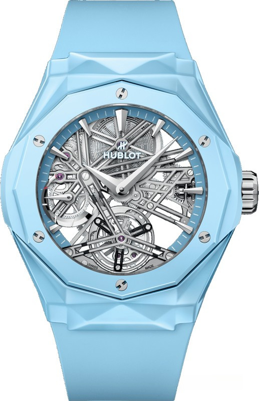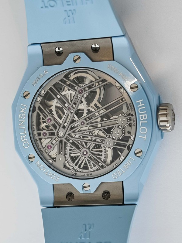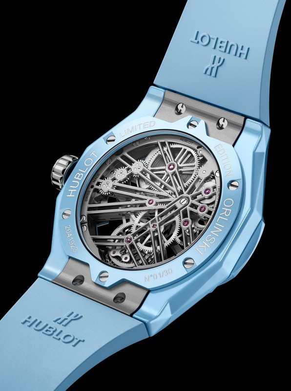 Часы Hublot Classic Fusion Tourbillon Orlinski представлены в корпусе размером 45 х 10.6 мм из керамики водонепроницаемостью 30 метров. Внутри корпуса установлен механизм с ручным заводом, Калибр HUB6021, обладающий запасом хода 115 часов. На серебристом циферблате отображаются часы, минуты, запас хода. Часы поставляются на каучуковом ремешке с титановой застежкой. Серия ограничена - 30 шт.