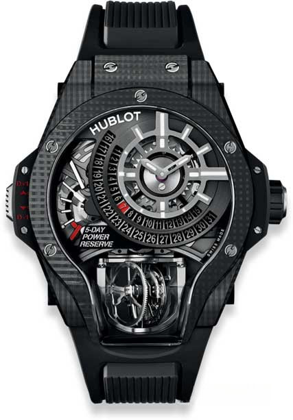 Креативность Hublot не знает границ. В своей новой модели MP-09 Tourbillon Bi-Axis мануфактура раздвигает рамки в понятии многоосных турбийонов. MP-09 Tourbillon Bi-Axis – результат идеи создать максимально просматриваемый турбийон, который вращается на двух осях. Новинка Hublot MP-09 Tourbillon Bi-Axis комплектуется автоматическим механизмом HUB9009.H1.RA с запасом хода 5 дней. Двухосный турбийон совершает один оборот за 1 минуту вокруг первой оси и за 30 секунд – вокруг второй. Турбийон постоянно находится в динамике. Захватывающим является также и дизайн корпуса. Стоит отметить, что механизм и корпус часов создавались специально один к одному. Турбийон расположен на 6-ти часах. Все индикаторы находятся в верхней части циферблата. Часовая и минутная стрелки расположены на 2-х часах. Этот дисплей объединен с ретроградной функцией даты. На 9-ти часах расположен индикатор запаса хода. Размер корпуса составляет 49 х 17.95 мм, водонепроницаемость корпуса 30 метров. Корпус часов изготовлен из карбона. Новинка комплектуется каучуковым ремешком с застежкой из материала, соответствующего корпусу часов. Серия ограничена - 50 штук.