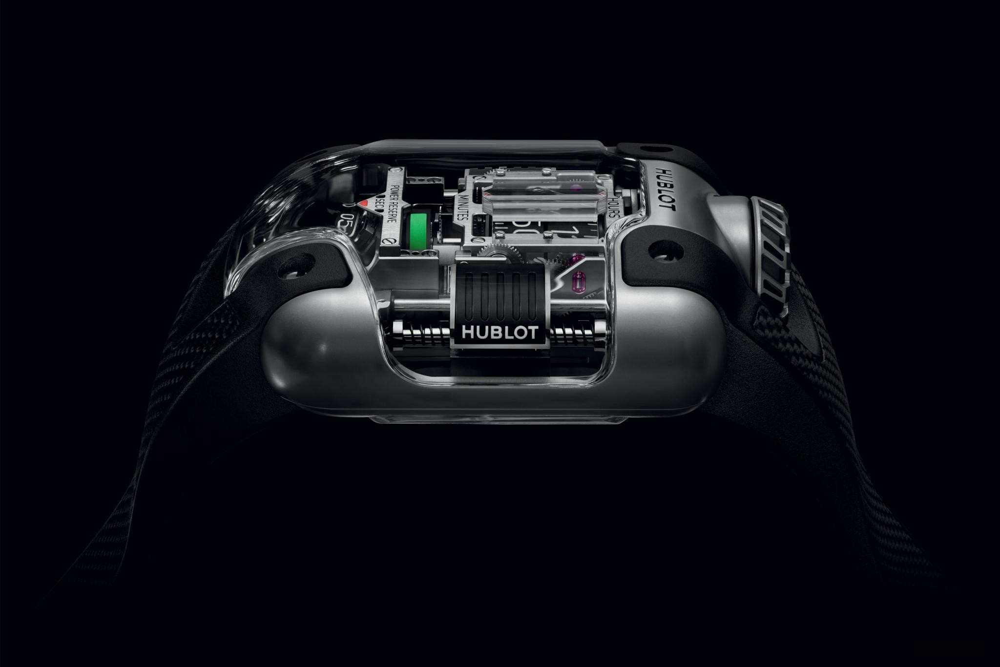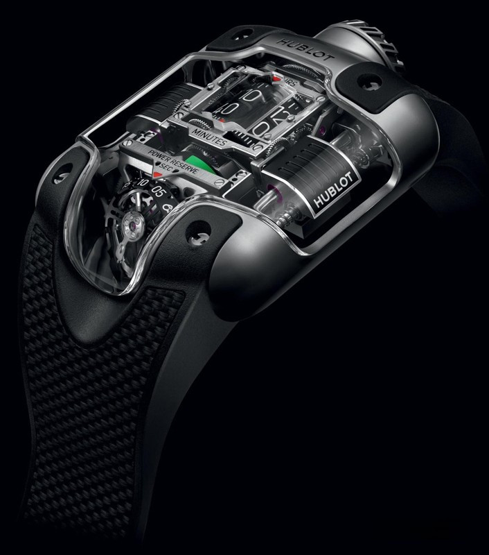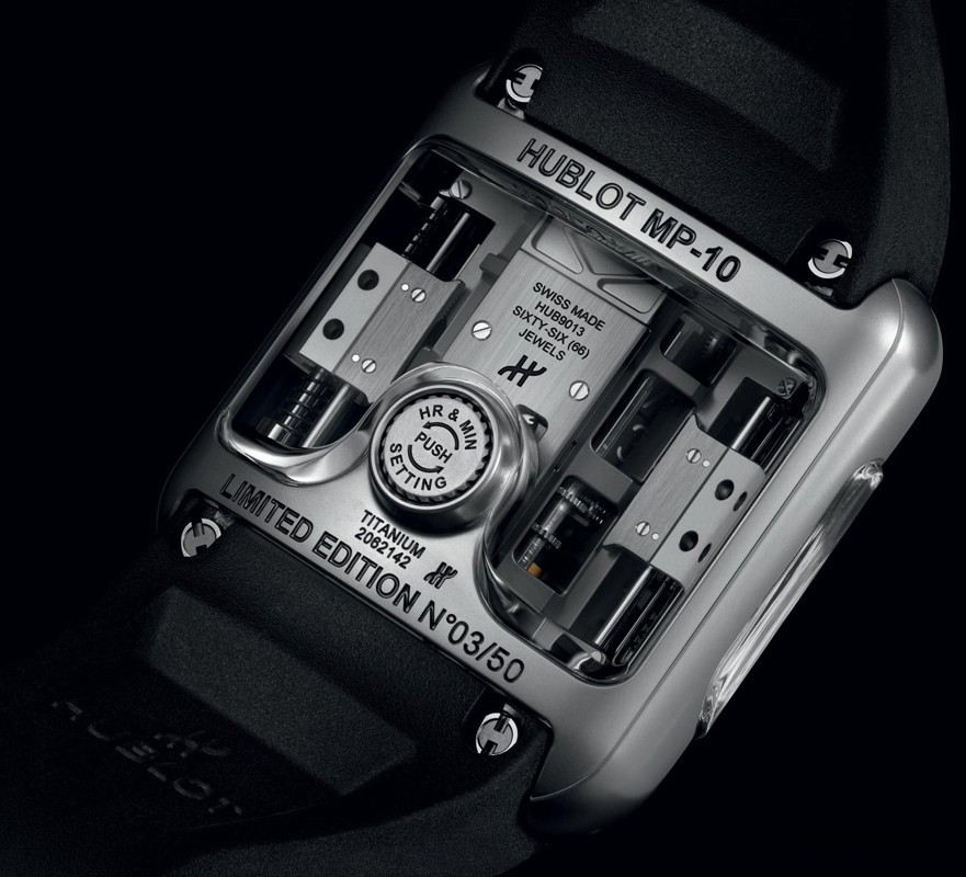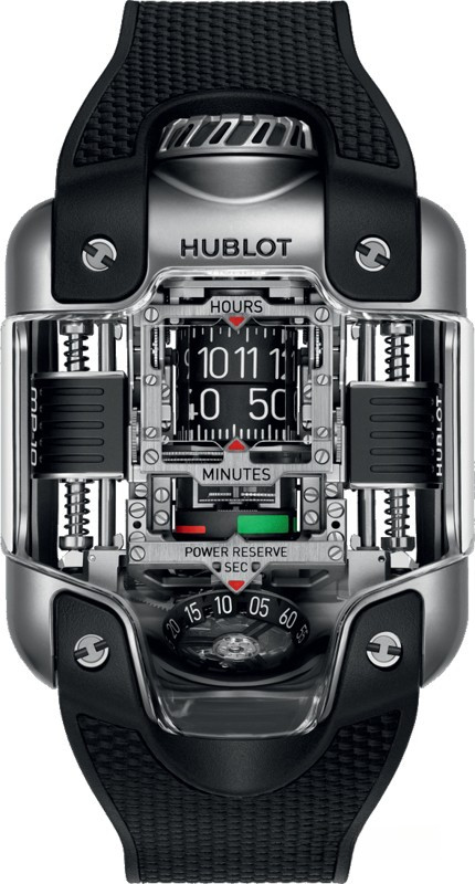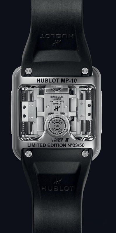 Часы Hublot MP-10 Tourbillon представлены в корпусе размером 54.1 x 41.5 мм из титана водонепроницаемостью 30 метров. Внутри корпуса установлен автоматический механизм, Калибр HUB9013, обладающий запасом хода 48 часов. На черном циферблате отображаются часы, минуты, запас хода. Часы поставляются на каучуковом ремешке с титановой застежкой.