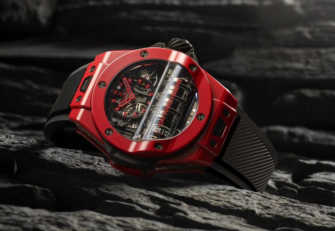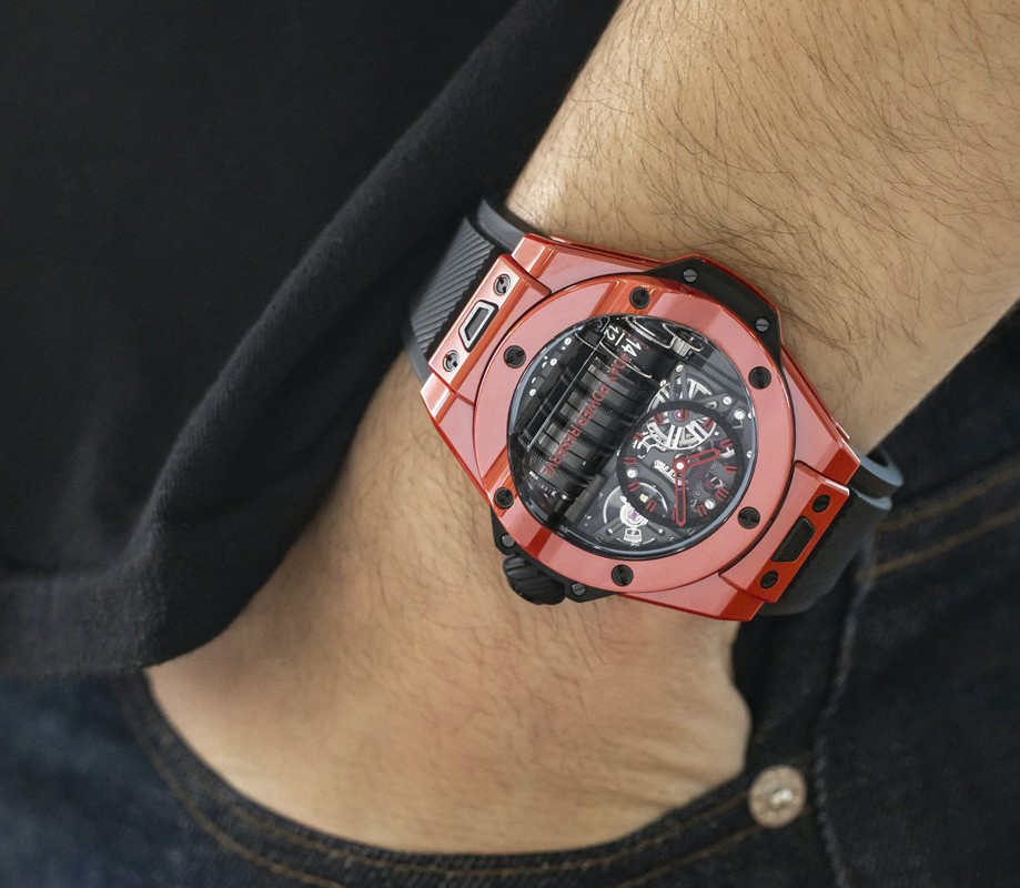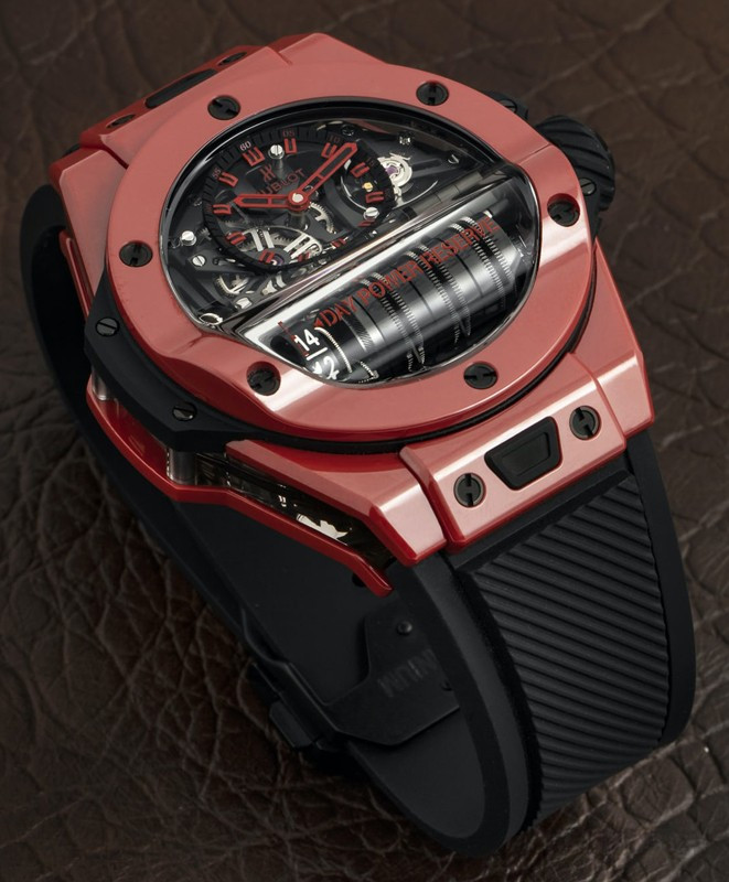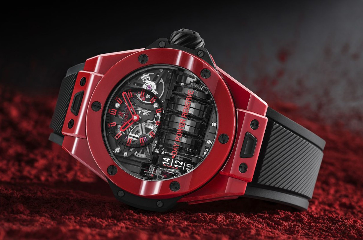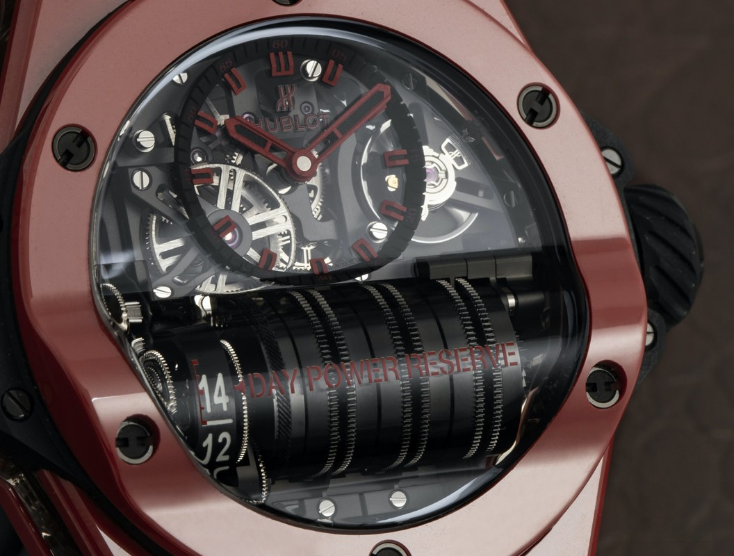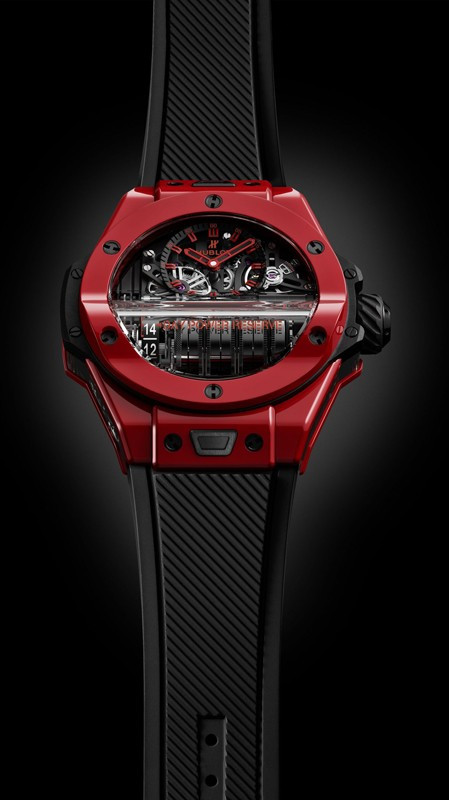 Часы Hublot Big Bang MP-11 представлены в корпусе из керамики. 45-миллиметровый корпус Hublot Big Bang MP-11 вмещает в себя механизм с ручным заводом, скелетон, обеспечивающий исключительный запас хода в две недели благодаря семи последовательно соединенным барабанам. Калибр Hublot HUB9011, состоящий из 270 компонентов и оснащенный кремниевым спуском, работает с частотой 4 Гц (28 800 полуколебаний в час). Читаемость циферблата часов / минут усилена стрелками и указателями, выделенными красным люминесцентным покрытием. Сапфировое стекло с антибликовым покрытием защищает корпус толщиной 14.4 мм. Часы Hublot Big Bang MP-11 поставляются в комплекте с черным структурированным каучуковым ремешком. Водонепроницаемость часов достигает 30 метров. Модель выпущена ограниченной серией 100 штук.