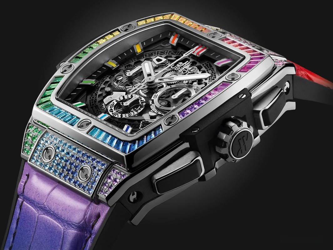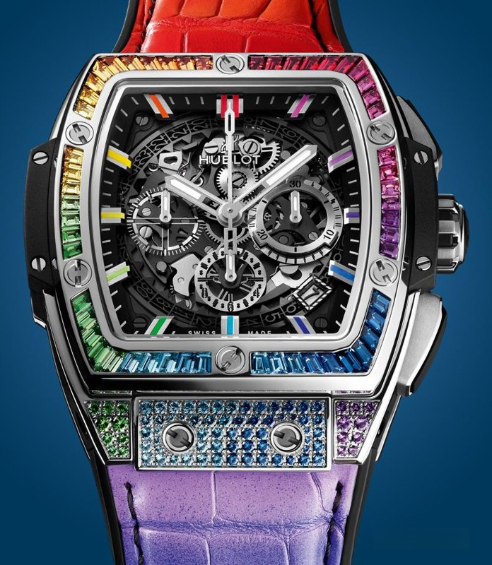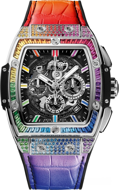 Hublot представляет часы с корпусом в форме бочонка из титана с безелем из белого золота 18к. Они не случайно носят название Spirit of Big Bang. В модели собраны все дизайнерские коды Big Bang: 6 титановых винтов с H-образной головкой на безеле, выступы на внешней стороне корпуса, два характерных крепления ремешка, знаменитые стрелки Hublot, индексы в форме палочки с составом SuperLuminova™, обеспечивающие превосходную читаемость показаний, завинчивающаяся заводная головка, покрытая каучуком и декорированная эмблематической литерой H. Кроме того, данная модель отличается уникальной модульной конструкцией корпуса, которая позволяет использовать практически неограниченное количество комбинаций материалов и цветов. Дизайн средней части корпуса с матовыми поверхностями и фрагментами с пескоструйной обработкой обусловливает в высшей степени техничный облик, выделяющий эти часы в линии Big Bang. Под циферблатом «пульсирует» новый Калибр Hublot HUB4700, результат тесного сотрудничества команд Hublot и Zénith. Специалисты Hublot радикально переосмыслили архитектуру и отделку автоматического механизма с 50-часовым запасом хода. Циферблат из сапфирового стекла позволяет по достоинству оценить изящество исполнения скелетонизированной конструкции, в том числе диск даты. На циферблате имеются окошко даты в положении "4 часа 30 минут", центральная секундная стрелка хронографа и три счетчика – у отметок "9 часов" (секундный), "3 часа" (30-минутный) и меньший размером в положении "6 часов" (часовой). К часам прилагается прошитый ремешок из кожи аллигатора с каучуковой подкладкой, делающей его еще более удобным, гибким и долговечным. Корпус - 166 рубинов, розовых сапфиров, аметистов, синих сапфиров, синих топазов, цаворитов, желтых и оранжевых сапфиров. Безель - 54 цветных драгоценных камня багетной огранки: рубины, розовые сапфиры, аметисты, синие сапфиры, синие топазы, цавориты, желтые и оранжевые сапфиры.
