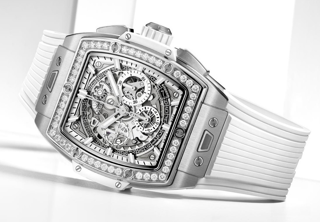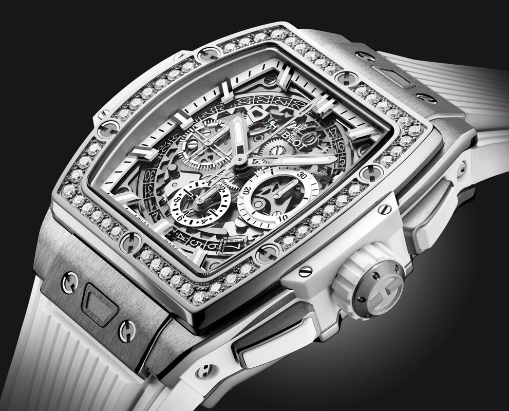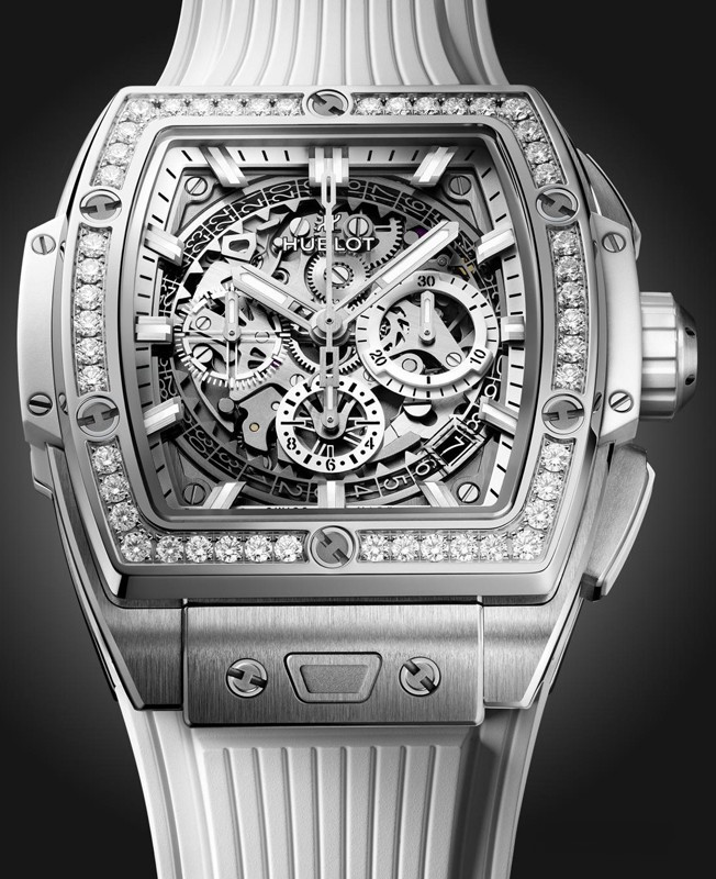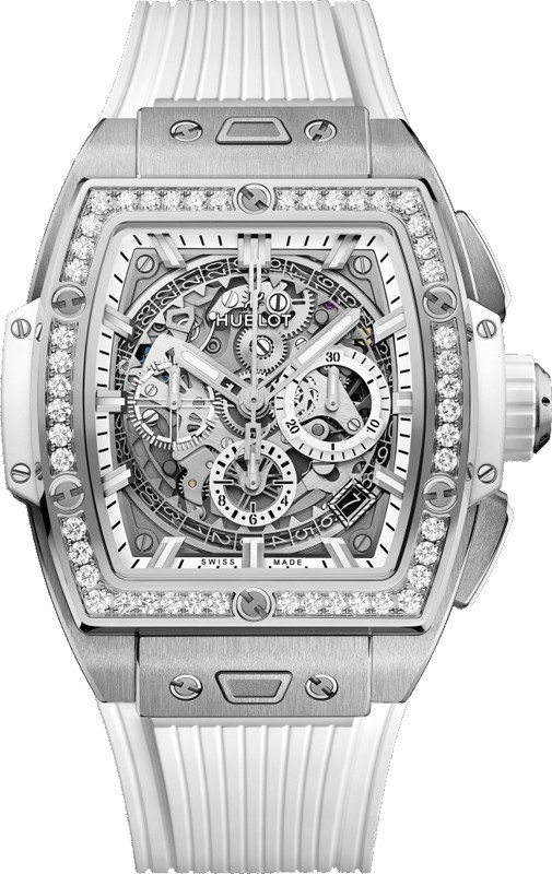 Hublot представляет часы с корпусом в форме бочонка из титана. Они не случайно носят название Spirit of Big Bang. В модели собраны все дизайнерские коды Big Bang: 6 винтов с H-образной головкой на безеле, выступы на внешней стороне корпуса, два характерных крепления ремешка, знаменитые стрелки Hublot, индексы в форме палочки с составом SuperLuminova™, обеспечивающие превосходную читаемость показаний, завинчивающаяся заводная головка, покрытая каучуком и декорированная эмблематической литерой H. Кроме того, данная модель отличается уникальной модульной конструкцией корпуса, которая позволяет использовать практически неограниченное количество комбинаций материалов и цветов. Дизайн средней части корпуса с матовыми поверхностями и фрагментами с пескоструйной обработкой обусловливает в высшей степени техничный облик, выделяющий эти часы в линии Big Bang. Под циферблатом «пульсирует» новый Калибр Hublot HUB4700, результат тесного сотрудничества команд Hublot и Zénith. Специалисты Hublot радикально переосмыслили архитектуру и отделку автоматического механизма с 50-часовым запасом хода. Циферблат из сапфирового стекла позволяет по достоинству оценить изящество исполнения скелетонизированной конструкции, в том числе диск даты. На циферблате имеются окошко даты в положении "4 часа 30 минут", центральная секундная стрелка хронографа и три счетчика – у отметок "9 часов" (секундный), "3 часа" (30-минутный) и меньший размером в положении "6 часов" (часовой). К часам прилагается каучуковый ремешок с титановой застежкой.