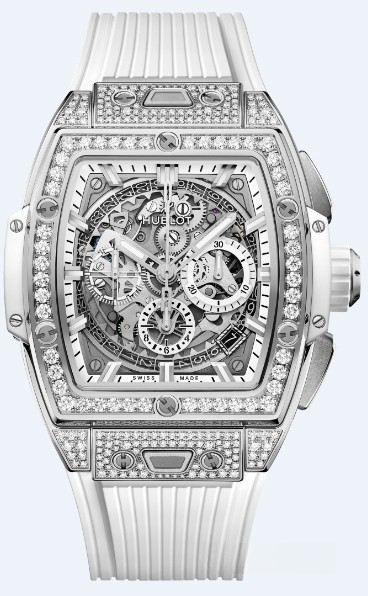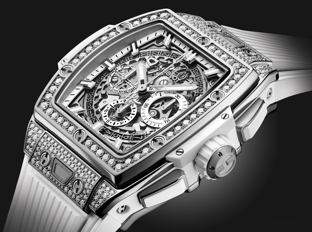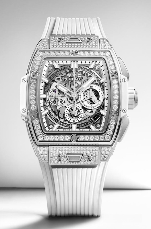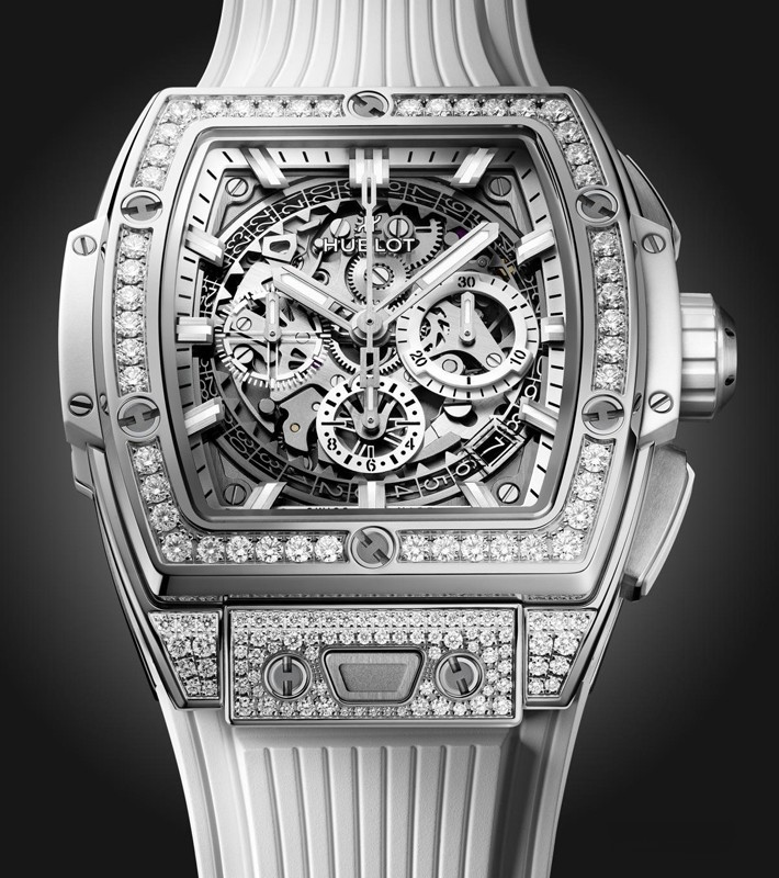 Hublot представляет часы с корпусом в форме бочонка из титана. Они не случайно носят название Spirit of Big Bang. В модели собраны все дизайнерские коды Big Bang: 6 винтов с H-образной головкой на безеле, выступы на внешней стороне корпуса, два характерных крепления ремешка, знаменитые стрелки Hublot, индексы в форме палочки с составом SuperLuminova™, обеспечивающие превосходную читаемость показаний, завинчивающаяся заводная головка, покрытая каучуком и декорированная эмблематической литерой H. Кроме того, данная модель отличается уникальной модульной конструкцией корпуса, которая позволяет использовать практически неограниченное количество комбинаций материалов и цветов. Дизайн средней части корпуса с матовыми поверхностями и фрагментами с пескоструйной обработкой обусловливает в высшей степени техничный облик, выделяющий эти часы в линии Big Bang. Под циферблатом «пульсирует» новый Калибр Hublot HUB4700, результат тесного сотрудничества команд Hublot и Zénith. Специалисты Hublot радикально переосмыслили архитектуру и отделку автоматического механизма с 50-часовым запасом хода. Циферблат из сапфирового стекла позволяет по достоинству оценить изящество исполнения скелетонизированной конструкции, в том числе диск даты. На циферблате имеются окошко даты в положении "4 часа 30 минут", центральная секундная стрелка хронографа и три счетчика – у отметок "9 часов" (секундный), "3 часа" (30-минутный) и меньший размером в положении "6 часов" (часовой). К часам прилагается каучуковый ремешок с титановой застежкой.
