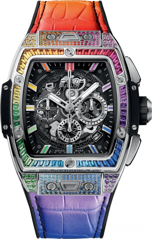 Hublot представляет часы с корпусом в форме бочонка из титана. Они не случайно носят название Spirit of Big Bang. В модели собраны все дизайнерские коды Big Bang: 6 винтов с H-образной головкой на безеле, выступы на внешней стороне корпуса, два характерных крепления ремешка, знаменитые стрелки Hublot, индексы в форме палочки с составом SuperLuminova™, обеспечивающие превосходную читаемость показаний, завинчивающаяся заводная головка, покрытая каучуком и декорированная эмблематической литерой H. Под циферблатом «пульсирует» Калибр Hublot HUB4700, результат тесного сотрудничества команд Hublot и Zénith. Специалисты Hublot радикально переосмыслили архитектуру и отделку автоматического механизма с 50-часовым запасом хода. Циферблат из сапфирового стекла позволяет по достоинству оценить изящество исполнения скелетонизированной конструкции, в том числе диск даты. На циферблате имеются окошко даты в положении "4 часа 30 минут", центральная секундная стрелка хронографа и три счетчика – у отметок "9 часов" (секундный), "3 часа" (30-минутный) и меньший размером в положении "6 часов" (часовой). К часам прилагается каучуковый ремешок с титановой застежкой.