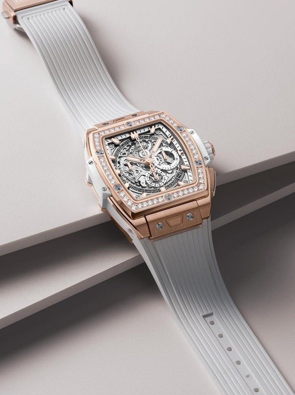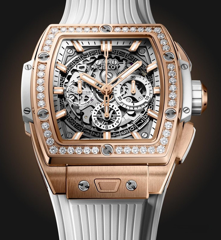 Hublot представляет часы с корпусом в форме бочонка из розового золота 18к. Они не случайно носят название Spirit of Big Bang. В модели собраны все дизайнерские коды Big Bang: 6 винтов с H-образной головкой на безеле, выступы на внешней стороне корпуса, два характерных крепления ремешка, знаменитые стрелки Hublot, индексы в форме палочки с составом SuperLuminova™, обеспечивающие превосходную читаемость показаний, завинчивающаяся заводная головка, покрытая каучуком и декорированная эмблематической литерой H. Кроме того, данная модель отличается уникальной модульной конструкцией корпуса, которая позволяет использовать практически неограниченное количество комбинаций материалов и цветов. Дизайн средней части корпуса с матовыми поверхностями и фрагментами с пескоструйной обработкой обусловливает в высшей степени техничный облик, выделяющий эти часы в линии Big Bang. Под циферблатом «пульсирует» новый Калибр Hublot HUB4700, результат тесного сотрудничества команд Hublot и Zénith. Специалисты Hublot радикально переосмыслили архитектуру и отделку автоматического механизма с 50-часовым запасом хода. Циферблат из сапфирового стекла позволяет по достоинству оценить изящество исполнения скелетонизированной конструкции, в том числе диск даты. На циферблате имеются окошко даты в положении "4 часа 30 минут", центральная секундная стрелка хронографа и три счетчика – у отметок "9 часов" (секундный), "3 часа" (30-минутный) и меньший размером в положении "6 часов" (часовой). К часам прилагается каучуковый ремешок с золотой застежкой.