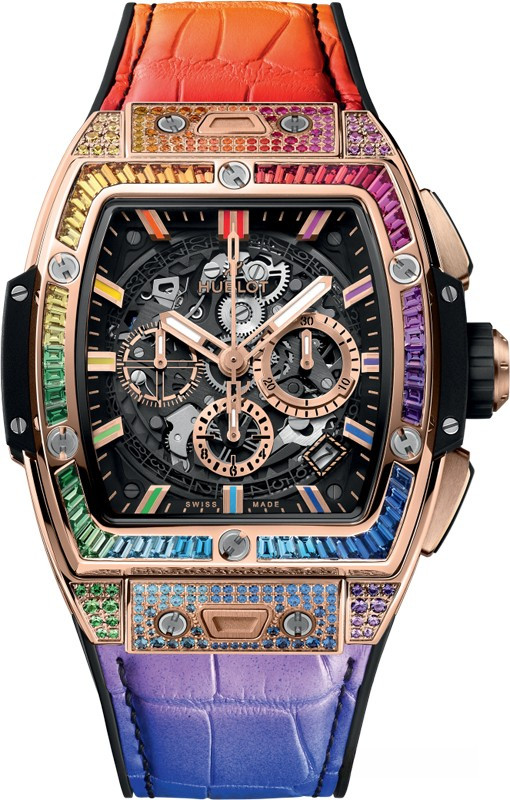 Hublot представляет часы с корпусом в форме бочонка из розового золота 18к. Они не случайно носят название Spirit of Big Bang. В модели собраны все дизайнерские коды Big Bang: 6 винтов с H-образной головкой на безеле, выступы на внешней стороне корпуса, два характерных крепления ремешка, знаменитые стрелки Hublot, индексы в форме палочки с составом SuperLuminova™, обеспечивающие превосходную читаемость показаний, завинчивающаяся заводная головка, покрытая каучуком и декорированная эмблематической литерой H. Под циферблатом «пульсирует» Калибр Hublot HUB4700, результат тесного сотрудничества команд Hublot и Zénith. Специалисты Hublot радикально переосмыслили архитектуру и отделку автоматического механизма с 50-часовым запасом хода. Циферблат из сапфирового стекла позволяет по достоинству оценить изящество исполнения скелетонизированной конструкции, в том числе диск даты. На циферблате имеются окошко даты в положении "4 часа 30 минут", центральная секундная стрелка хронографа и три счетчика – у отметок "9 часов" (секундный), "3 часа" (30-минутный) и меньший размером в положении "6 часов" (часовой). К часам прилагается каучуковый ремешок с золотой застежкой.