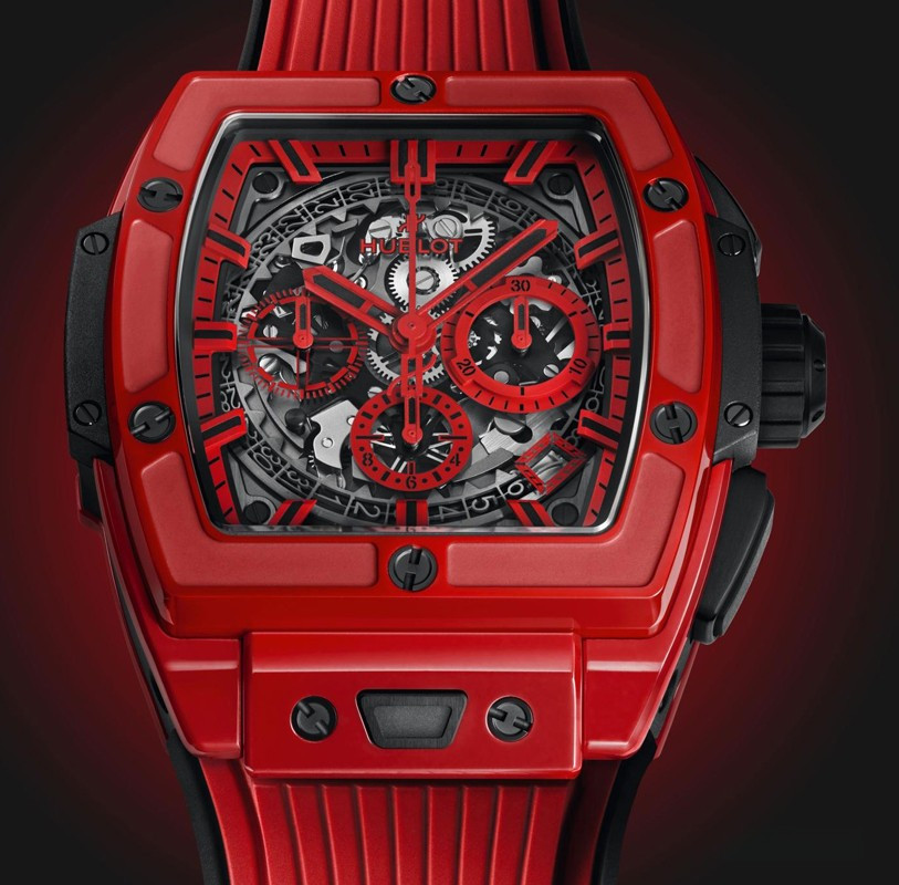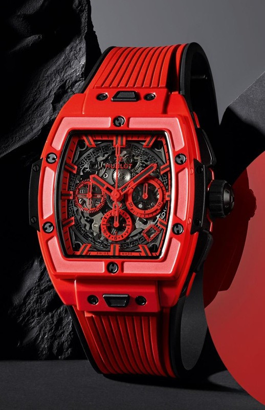 Hublot представляет часы с корпусом в форме бочонка из керамики. Они не случайно носят название Spirit of Big Bang. В модели собраны все дизайнерские коды Big Bang: 6 винтов с H-образной головкой на безеле, выступы на внешней стороне корпуса, два характерных крепления ремешка, знаменитые стрелки Hublot, индексы в форме палочки с составом SuperLuminova™, обеспечивающие превосходную читаемость показаний, завинчивающаяся заводная головка, покрытая каучуком и декорированная эмблематической литерой H. Кроме того, данная модель отличается уникальной модульной конструкцией корпуса, которая позволяет использовать практически неограниченное количество комбинаций материалов и цветов. Под циферблатом «пульсирует» новый Калибр Hublot HUB4700, результат тесного сотрудничества команд Hublot и Zénith. Специалисты Hublot радикально переосмыслили архитектуру и отделку автоматического механизма с 50-часовым запасом хода. Циферблат из сапфирового стекла позволяет по достоинству оценить изящество исполнения скелетонизированной конструкции, в том числе диск даты. На циферблате имеются окошко даты в положении "4 часа 30 минут", центральная секундная стрелка хронографа и три счетчика – у отметок "9 часов" (секундный), "3 часа" (30-минутный) и меньший размером в положении "6 часов" (часовой). К часам прилагается каучуковый ремешок с титановой застежкой. Серия ограничена - 250 шт.