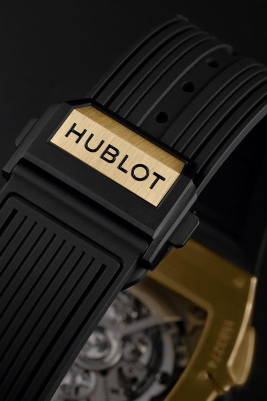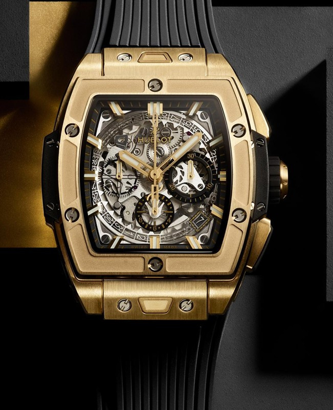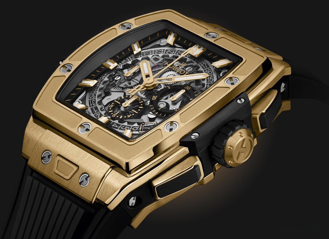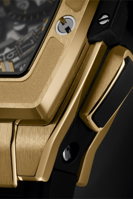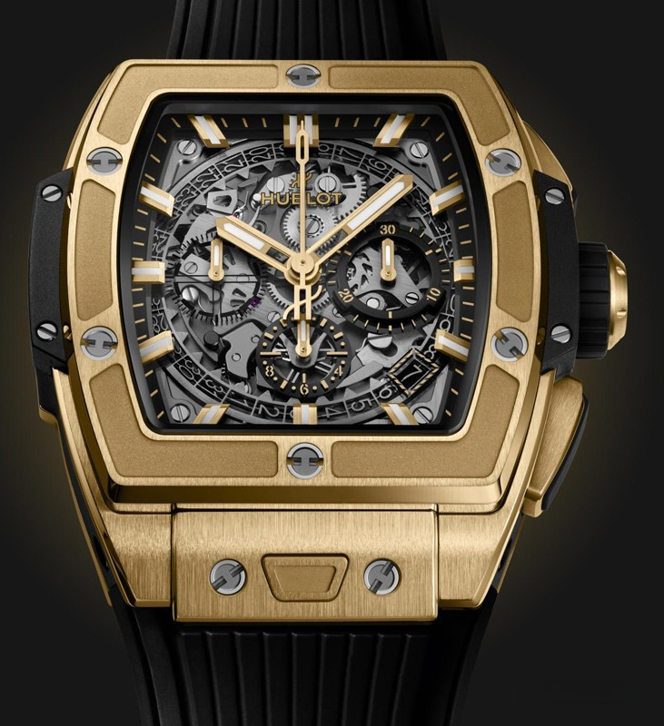 Hublot представляет часы с корпусом в форме бочонка из желтого золота 18к. Они не случайно носят название Spirit of Big Bang. В модели собраны все дизайнерские коды Big Bang: 6 титановых винтов с H-образной головкой на безеле, выступы на внешней стороне корпуса, два характерных крепления ремешка, знаменитые стрелки Hublot, индексы в форме палочки с составом SuperLuminova™, обеспечивающие превосходную читаемость показаний, завинчивающаяся заводная головка, покрытая каучуком и декорированная эмблематической литерой H. Кроме того, данная модель отличается уникальной модульной конструкцией корпуса, которая позволяет использовать практически неограниченное количество комбинаций материалов и цветов. Дизайн средней части корпуса с матовыми поверхностями и фрагментами с пескоструйной обработкой обусловливает в высшей степени техничный облик, выделяющий эти часы в линии Big Bang. Под циферблатом «пульсирует» новый Калибр Hublot HUB4700, результат тесного сотрудничества команд Hublot и Zénith. Специалисты Hublot радикально переосмыслили архитектуру и отделку автоматического механизма с 50-часовым запасом хода. Циферблат из сапфирового стекла позволяет по достоинству оценить изящество исполнения скелетонизированной конструкции, в том числе диск даты. На циферблате имеются окошко даты в положении "4 часа 30 минут", центральная секундная стрелка хронографа и три счетчика – у отметок "9 часов" (секундный), "3 часа" (30-минутный) и меньший размером в положении "6 часов" (часовой). К часам прилагается каучуковый ремешок с золотой застежкой.