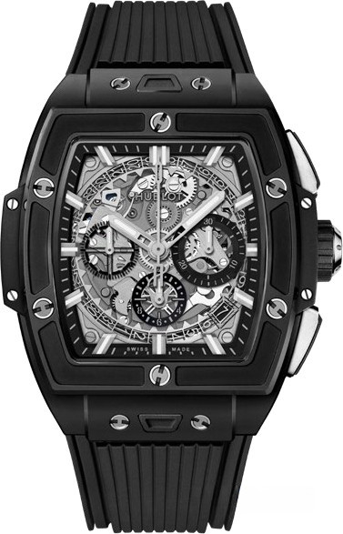 Hublot представляет часы с корпусом в форме бочонка из керамики. Они не случайно носят название Spirit of Big Bang. В модели собраны все дизайнерские коды Big Bang: 6 титановых винтов с H-образной головкой на безеле, выступы на внешней стороне корпуса, два характерных крепления ремешка, знаменитые стрелки Hublot, индексы в форме палочки с составом SuperLuminova™, обеспечивающие превосходную читаемость показаний, завинчивающаяся заводная головка, покрытая каучуком и декорированная эмблематической литерой H. Кроме того, данная модель отличается уникальной модульной конструкцией корпуса, которая позволяет использовать практически неограниченное количество комбинаций материалов и цветов. Дизайн средней части корпуса с матовыми поверхностями и фрагментами с пескоструйной обработкой обусловливает в высшей степени техничный облик, выделяющий эти часы в линии Big Bang. Под циферблатом «пульсирует» новый Калибр Hublot HUB4700, результат тесного сотрудничества команд Hublot и Zénith. Специалисты Hublot радикально переосмыслили архитектуру и отделку автоматического механизма с 50-часовым запасом хода. Циферблат из сапфирового стекла позволяет по достоинству оценить изящество исполнения скелетонизированной конструкции, в том числе диск даты. На циферблате имеются окошко даты в положении "4 часа 30 минут", центральная секундная стрелка хронографа и три счетчика – у отметок "9 часов" (секундный), "3 часа" (30-минутный) и меньший размером в положении "6 часов" (часовой). К часам прилагается каучуковый ремешок с керамической вставкой.