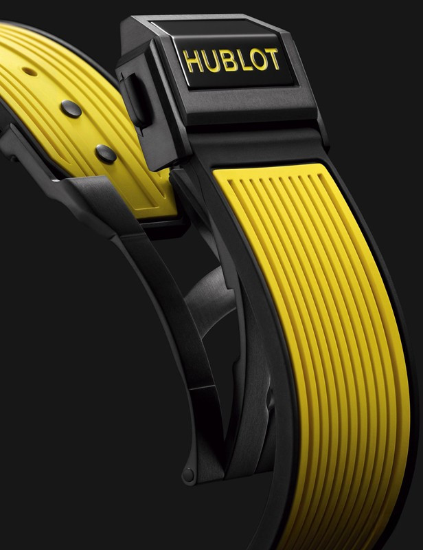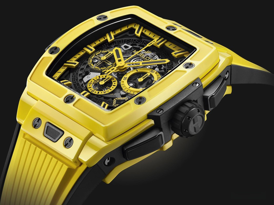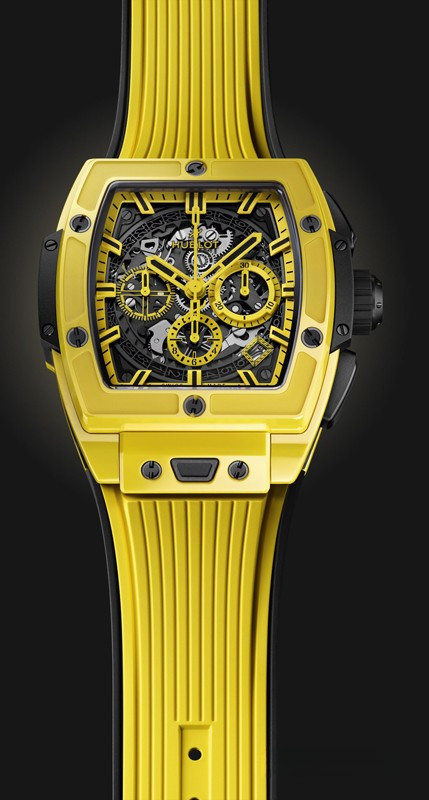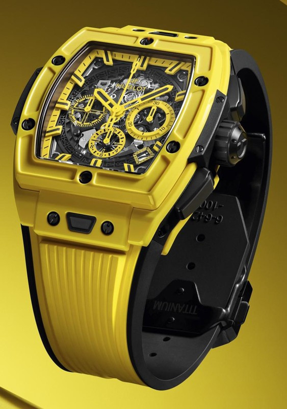 Hublot представляет часы с корпусом в форме бочонка из желтой керамики. Они не случайно носят название Spirit of Big Bang. В модели собраны все дизайнерские коды Big Bang: 6 винтов с H-образной головкой на безеле, выступы на внешней стороне корпуса, два характерных крепления ремешка, знаменитые стрелки Hublot, индексы в форме палочки с составом SuperLuminova™, обеспечивающие превосходную читаемость показаний, завинчивающаяся заводная головка, покрытая каучуком и декорированная эмблематической литерой H. Под циферблатом «пульсирует» Калибр Hublot HUB4700, результат тесного сотрудничества команд Hublot и Zénith. Специалисты Hublot радикально переосмыслили архитектуру и отделку автоматического механизма с 50-часовым запасом хода. Циферблат из сапфирового стекла позволяет по достоинству оценить изящество исполнения скелетонизированной конструкции, в том числе диск даты. На циферблате имеются окошко даты в положении "4 часа 30 минут", центральная секундная стрелка хронографа и три счетчика – у отметок "9 часов" (секундный), "3 часа" (30-минутный) и меньший размером в положении "6 часов" (часовой). К часам прилагается каучуковый ремешок с титановой застежкой. Серия ограничена - 200 шт.