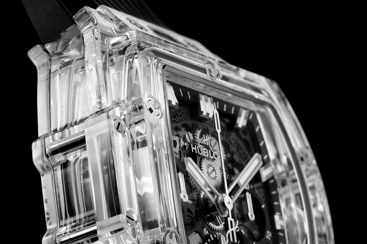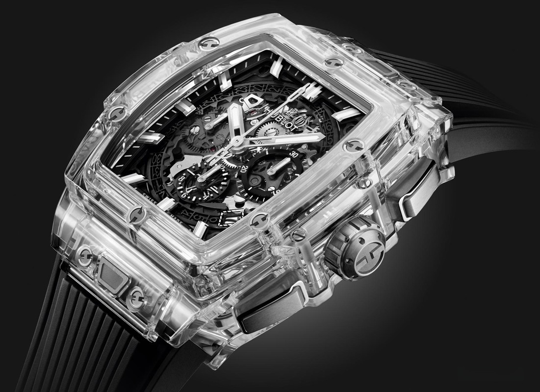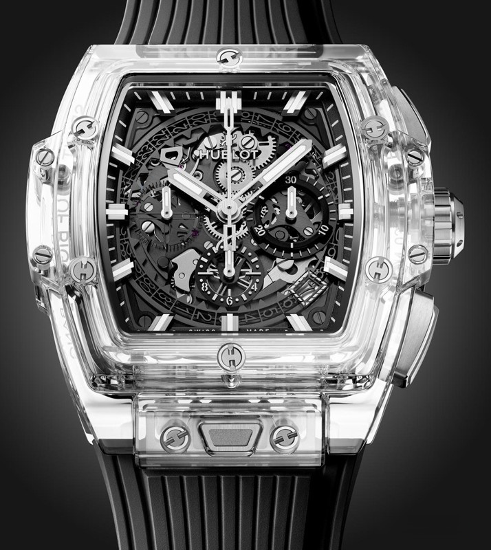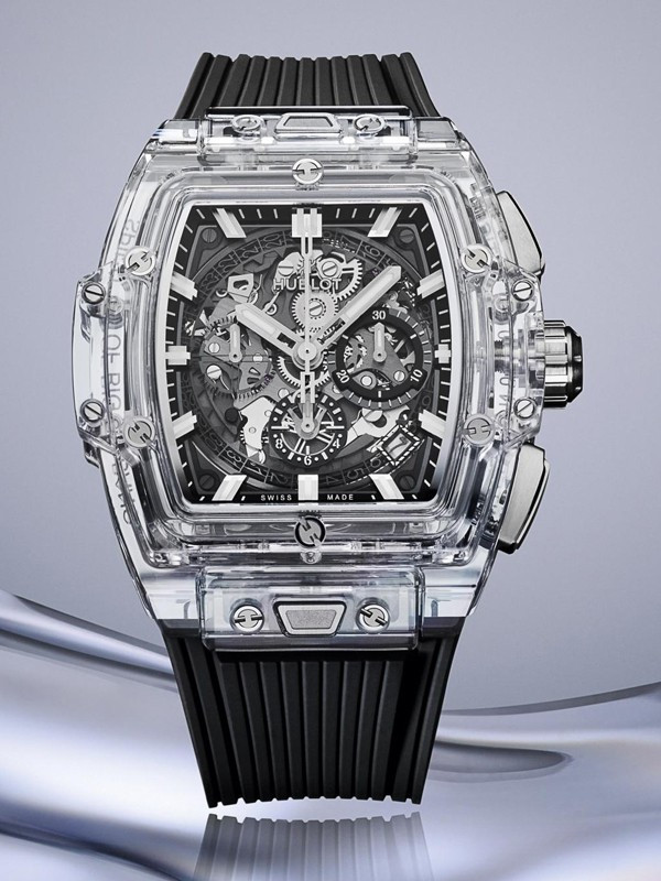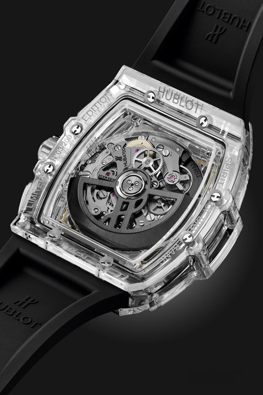 Hublot представляет часы с корпусом в форме бочонка из сапфира. Они не случайно носят название Spirit of Big Bang. В модели собраны все дизайнерские коды Big Bang: 6 винтов с H-образной головкой на безеле, выступы на внешней стороне корпуса, два характерных крепления ремешка, знаменитые стрелки Hublot, индексы в форме палочки с составом SuperLuminova™, обеспечивающие превосходную читаемость показаний, завинчивающаяся заводная головка, покрытая каучуком и декорированная эмблематической литерой H. Кроме того, данная модель отличается уникальной модульной конструкцией корпуса, которая позволяет использовать практически неограниченное количество комбинаций материалов и цветов. Под циферблатом «пульсирует» новый Калибр Hublot HUB4700, результат тесного сотрудничества команд Hublot и Zénith. Специалисты Hublot радикально переосмыслили архитектуру и отделку автоматического механизма с 50-часовым запасом хода. Циферблат из сапфирового стекла позволяет по достоинству оценить изящество исполнения скелетонизированной конструкции, в том числе диск даты. На циферблате имеются окошко даты в положении "4 часа 30 минут", центральная секундная стрелка хронографа и три счетчика – у отметок "9 часов" (секундный), "3 часа" (30-минутный) и меньший размером в положении "6 часов" (часовой). К часам прилагается каучуковый ремешок с титановой застежкой. Серия ограничена - 200 шт.