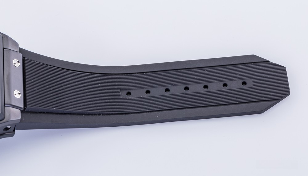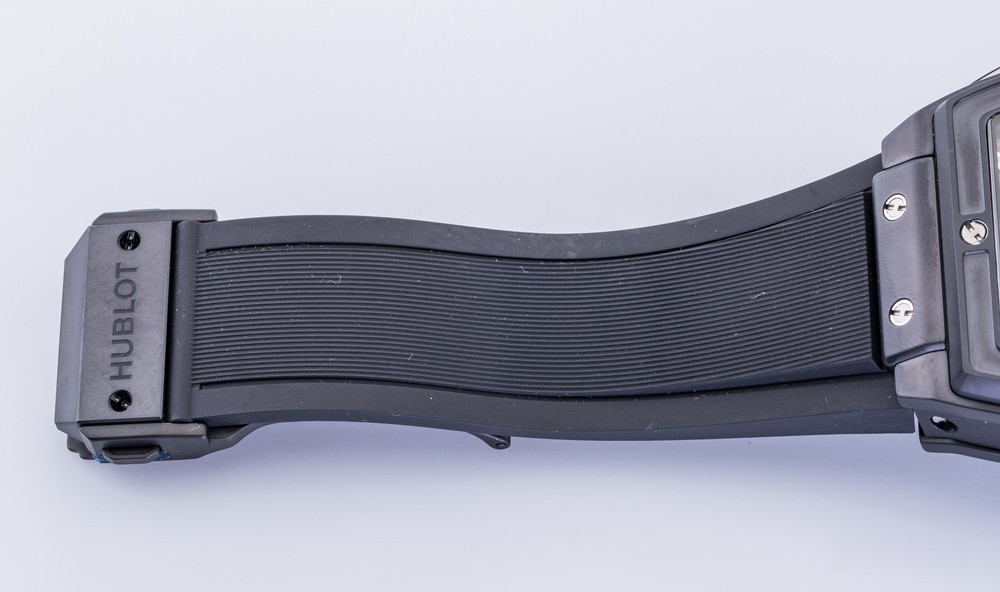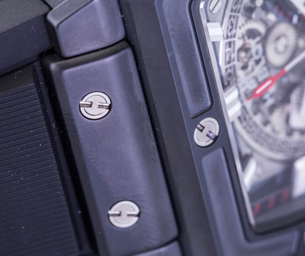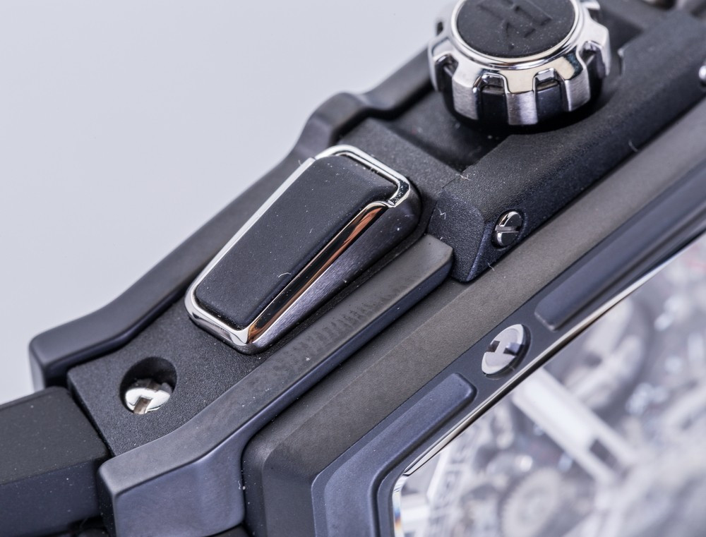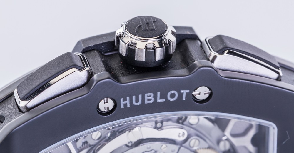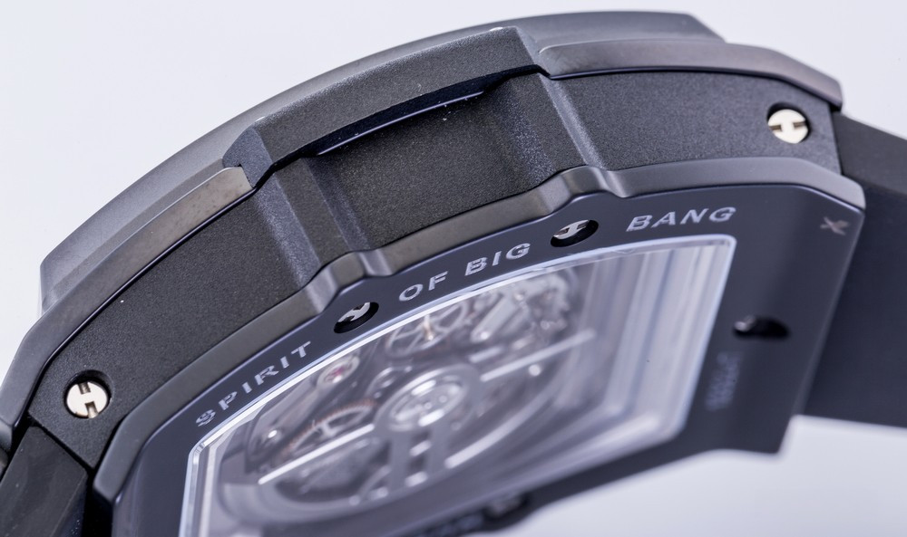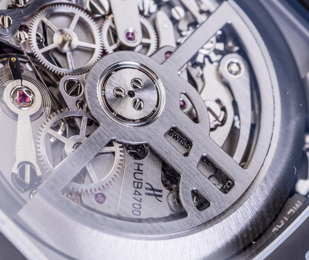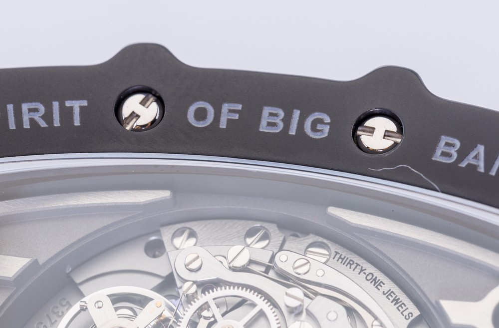 Модель представляет собой квинтэссенцию линии Big Bang: 6 титановых винтов с H-образной головкой на безеле, выступы на внешней стороне корпуса, два характерных крепления ремешка, знаменитые стрелки Hublot, индексы в форме палочки с составом SuperLuminova™, обеспечивающие превосходную читаемость показаний, завинчивающаяся заводная головка, покрытая каучуком и декорированная эмблематической литерой H. Корпус в форме бочонка выполнен из керамики. Под циферблатом «пульсирует» новый Калибр Hublot HUB4700, результат тесного сотрудничества команд Hublot и Zénith. Специалисты Hublot радикально переосмыслили архитектуру и отделку автоматического механизма с 50-часовым запасом хода. Циферблат из сапфирового стекла позволяет по достоинству оценить изящество исполнения скелетонизированной конструкции, в том числе диск даты. На циферблате имеется окошко даты в положении "4 часа 30 минут", центральная секундная стрелка хронографа и три счетчика – у отметок "9 часов" (секундный), "3 часа" (30-минутный) и меньший размером в положении "6 часов" (часовой). К часам прилагается прошитый ремешок из кожи аллигатора с каучуковой подкладкой, делающей его еще более удобным, гибким и долговечным.