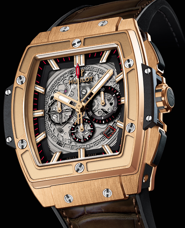 Hublot представляет часы с корпусом в форме бочонка из розового золота. Они не случайно носят название Spirit of Big Bang. В модели собраны все дизайнерские коды Big Bang: 6 титановых винтов с H-образной головкой на безеле, выступы на внешней стороне корпуса, два характерных крепления ремешка, знаменитые стрелки Hublot, индексы в форме палочки с составом SuperLuminova™, обеспечивающие превосходную читаемость показаний, завинчивающаяся заводная головка, покрытая каучуком и декорированная эмблематической литерой H. Кроме того, данная модель серии BIG BANG отличается уникальной модульной конструкцией корпуса, которая позволяет использовать практически неограниченное количество комбинаций материалов и цветов. Дизайн средней части корпуса с матовыми поверхностями и фрагментами с пескоструйной обработкой обусловливает в высшей степени техничный облик, выделяющий эти часы в линии Big Bang. Под циферблатом «пульсирует» новый Калибр Hublot HUB4700, результат тесного сотрудничества команд Hublot и Zénith. Специалисты Hublot радикально переосмыслили архитектуру и отделку автоматического механизма с 50-часовым запасом хода. Циферблат из сапфирового стекла позволяет по достоинству оценить изящество исполнения скелетонизированной конструкции, в том числе диск даты, и обеспечивает лучшую защиту от подделок. На циферблате имеются окошко даты в положении "4 часа 30 минут", центральная секундная стрелка хронографа и три счетчика – у отметок "9 часов" (секундный), "3 часа" (30-минутный) и меньший размером в положении "6 часов" (часовой). К часам прилагается прошитый ремешок из кожи аллигатора с каучуковой подкладкой, делающей его еще более удобным, гибким и долговечным.
