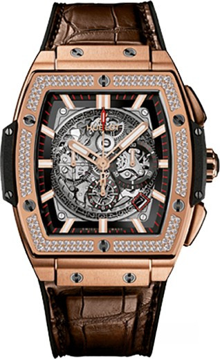 Водостойкие часы Hublot Spirit of Big Bang King Gold Diamonds Chronograph являются хронографом, выпущены в корпусе из розового золота 18к. Размер составляет 47.7 х 56.3 мм, водонепроницаемость 100 м, безель из белых бриллиантов. Внутри корпуса установлен автоматический механизм. На сером скелетированном циферблате отображаются часы, минуты, секунды, дата. Часы комплектуются каучуковым ремешком с нашитой кожей аллигатора и титановой застежкой.