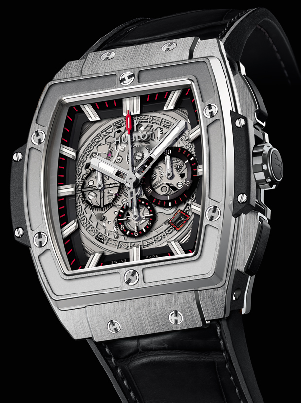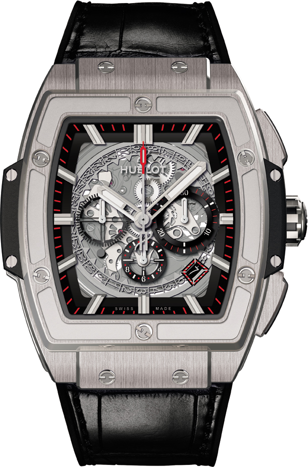 Модель представляет собой квинтэссенцию линии Big Bang: 6 титановых винтов с H-образной головкой на безеле, выступы на внешней стороне корпуса, два характерных крепления ремешка, знаменитые стрелки Hublot, индексы в форме палочки с составом SuperLuminova™, обеспечивающие превосходную читаемость показаний, завинчивающаяся заводная головка, покрытая каучуком и декорированная эмблематической литерой H. Корпус в форме бочонка выполнен из титана. Под циферблатом «пульсирует» новый калибр Hublot HUB4700, результат тесного сотрудничества команд Hublot и Zénith. Специалисты Hublot радикально переосмыслили архитектуру и отделку автоматического механизма с 50-часовым запасом хода. Циферблат из сапфирового стекла позволяет по достоинству оценить изящество исполнения скелетонизированной конструкции, в том числе диск даты. На циферблате имеется окошко даты в положении "4 часа 30 минут", центральная секундная стрелка хронографа и три счетчика – у отметок "9 часов" (секундный), "3 часа" (30-минутный) и меньший размером в положении "6 часов" (часовой). К часам прилагается прошитый ремешок из кожи аллигатора с каучуковой подкладкой, делающей его еще более удобным, гибким и долговечным.