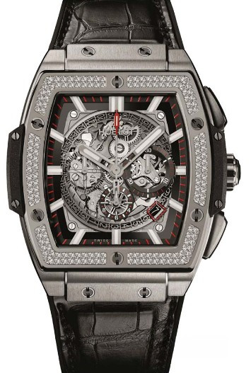 Водостойкие часы Hublot Spirit of Big Bang Titanium Diamonds Chronograph являются хронографом, выпущены в корпусе из титана. Размер составляет 45 х 51 мм, водонепроницаемость 100 м, безель из белых бриллиантов. Внутри корпуса установлен автоматический механизм. На сером скелетированном циферблате отображаются часы, минуты, секунды, дата. Часы комплектуются каучуковым ремешком с нашитой кожей аллигатора и титановой застежкой.